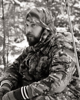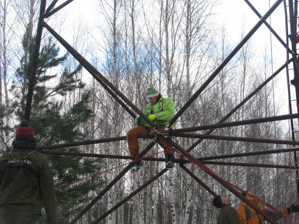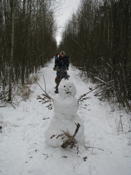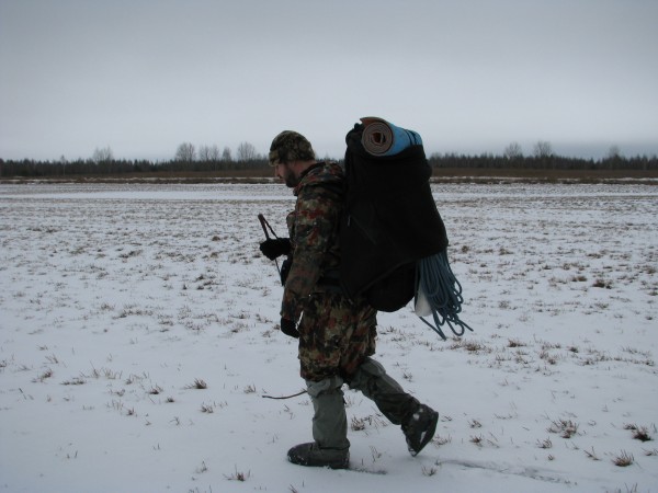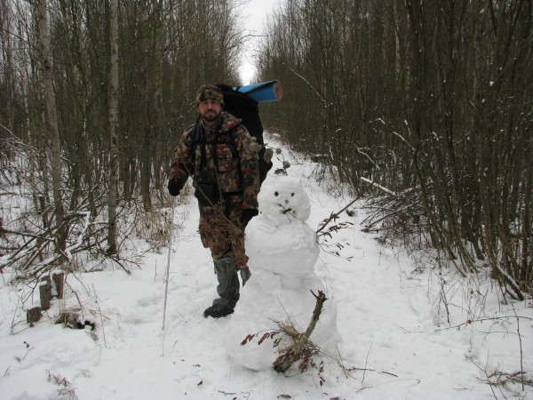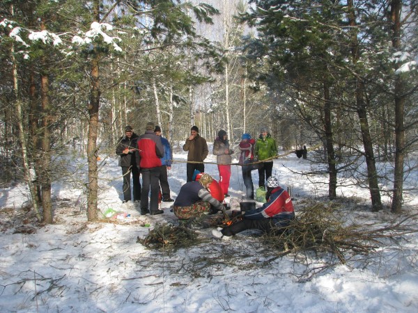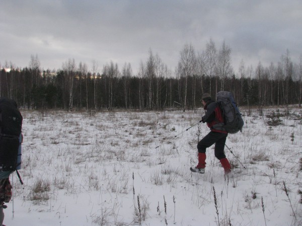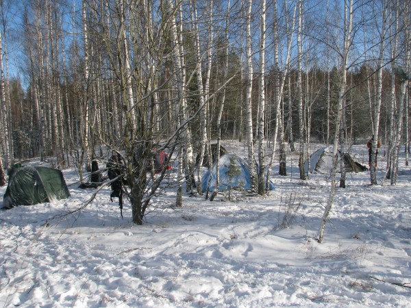 Я марудна, з фанарыкам, усталяваў намёт. Трэба адзначыць, што далёка не усе калкі мне удалося добра уладкаваць у мёрзлую зямлю. Сяргей дапамагаў з дровамі.
