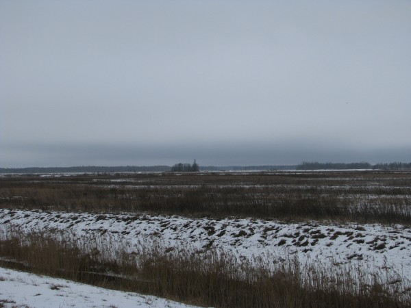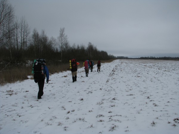 Фарсіруючы меліярацыйны канал выйшлi на поле, злёгку прыкрытае снегам. Трохі далей грунтавая дарога, дзе пад свежым сняжком хаваецца каварны лёд, дзякуючы якому некаторыя турысты час ад часу выконвалi складаныя акрабатычныя кульбіты.