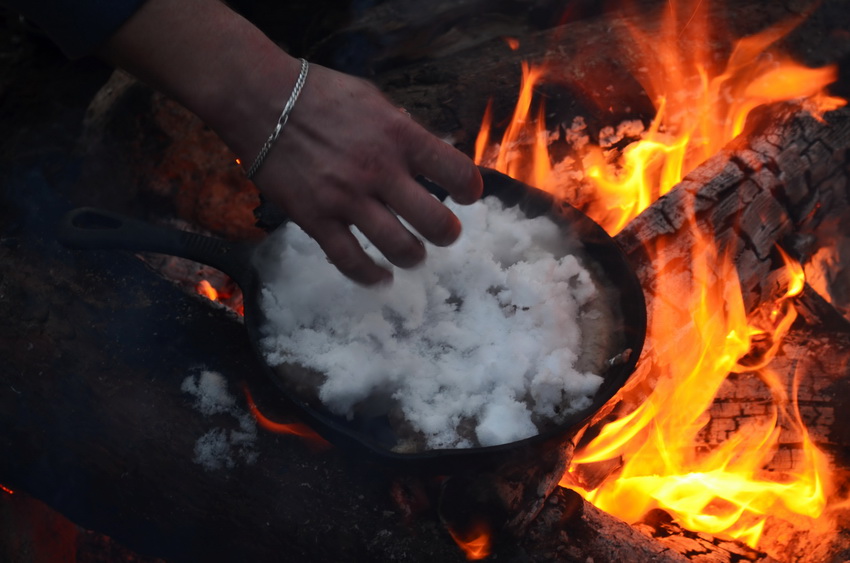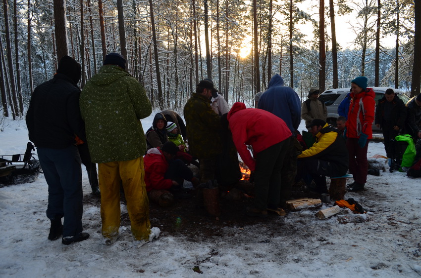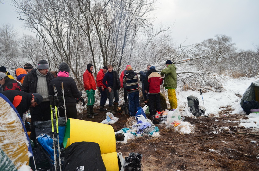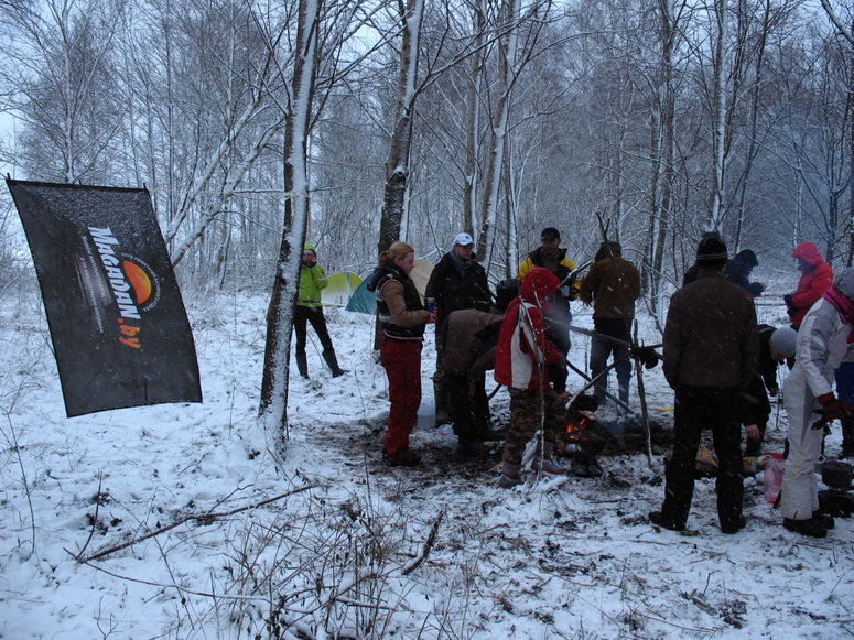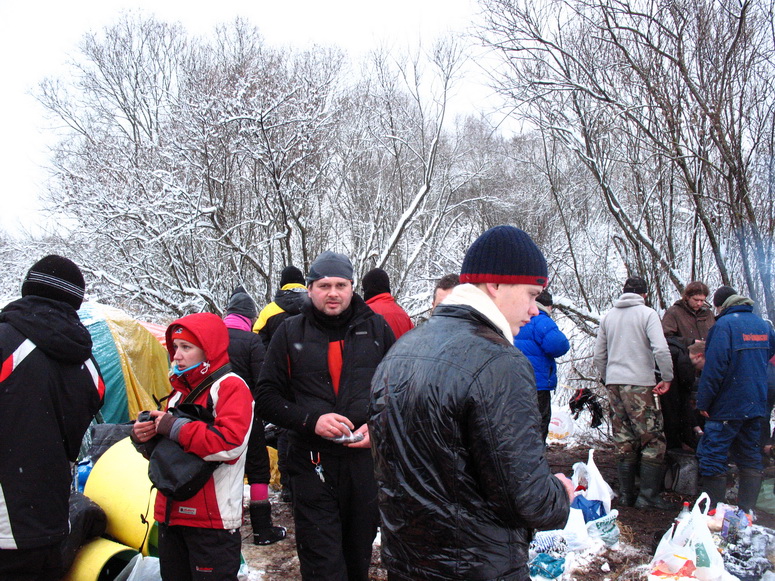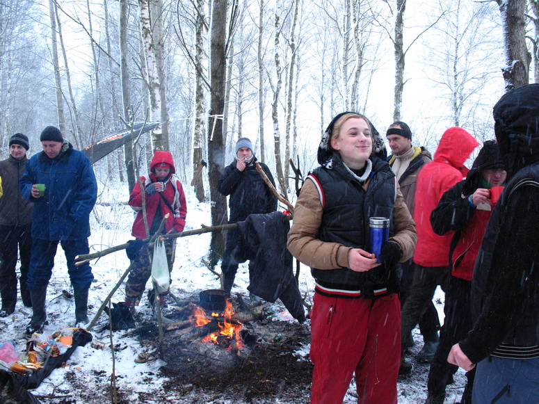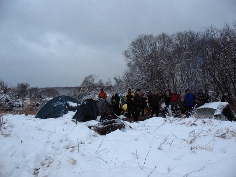 Разворачивали лагерь дружно. Вскоре занялся костер. Трещал в округе ломаемый хворост. Раздавались высокопарные изречения и спич. Двадцать пять человек слились в разноголосый гам. Требовалось набрать воды. Хоть место под лагерь и выбиралось недавно под визуальным контролем на берегу озера, саму акваторию озера я в темноте найти теперь почему-то не мог. Взялся помогать в этом друг Паленого Дима Мерзликин. Однако, даже с его помощью мы упирались в какие-то мелкие не замерзшие канавы, где вода быстро баламутилась и особенно набиралось в котелок гнилых осиновых листьев. Глаз не растерялся - придумал озеро найти с помощью навигатора. Получилось быстро и в двадцати шагах. Воду сковал первый хрупкий ледок и сахаристо присыпал снег. Туда охотно перескочил через не замерзший заберег Мерзликин и протянул руку не то за котелками, не то чтоб Глаз вылез тоже.