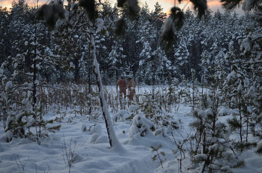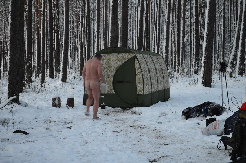 Всё стало экспрессивнее и насыщенней чуть позже. Очевидный признак появления в парилке Русьянова. Потом возгласы одевающихся в предбаннике: как обычно кто-то потерял трусы. Спустя еще не много мы увидели чистую белую жопу, потом в поле зрения появились еще обнаженные люди. Поднимался пар. Две фигуры, вышагивая по тропинке и кренясь то на один бок, то на другой направились ко льду озера - в майну.