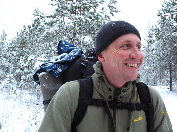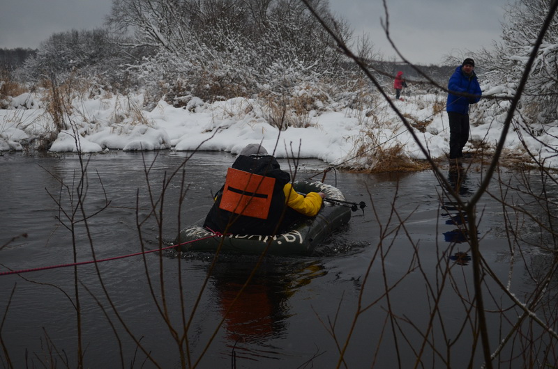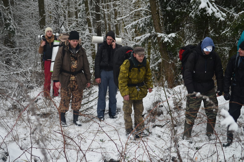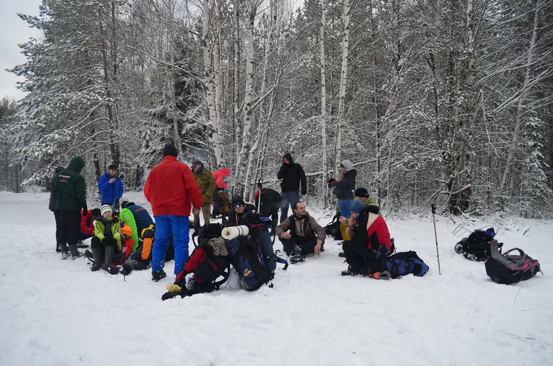 Люблю предпоходное время – суматошные сборы, ожидание предстоящих приключений и общения с соучастниками, магаданские «обнимашки» при встрече. И в этот раз все было именно так: вечер, легкий снежок, толпа людей с рюкзаками у станции метро « Уручье». Удивленные лица прохожих. И счастливые Магаданцы – впереди 3 дня активного отдыха, единения с природой, испытания себя! Немного грустный Саша Смирнов, не участвующий в мероприятии по семейным обстоятельствам. Загрузились в микроавтобусы и укатили в ночь. Ехалось весело (подарок Саши Смирнова этому способствовал). Полные энтузиазма выгрузились на обочине в условленном месте. Там уже прогуливался Сережа Волосач, как будто бы чисто случайно. Команда еще немного пообщалась, разделилась на группы и тронулась в сторону первой стоянки – вперед по узкоколейке. Затейники вышли последними, у них общение затянулось ( дообщались до того, что теперь мы с Андреем Руссияновым почему – то готовим голубцы в следующем походе). Первый день мне показался каким – то коротким, не успели выйти – и уже пришли. Ну конечно же в пути группы периодически тормозили, перекрещивались, подкреплялись… Когда свернули с узкоколейки к месту ночевки, был небольшой эпизод миниболотинга с переправой через ручей – такие мелочи в свете предстоящих событий… Ну и обязательные ночные посиделки, костер, песни.