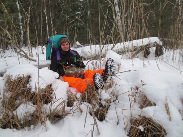 Даааа, тяжело нам дались эти 500 метров. Продирались долго и упорно. Но это же упорство рано или поздно должно было увенчаться успехом, и таки увенчалось - выбрались мы на берег, то бишь на болотную дюну. Глаз сказал, что по навигатору то мы уже пришли вроде, но светло же еще, и надел надо на завтра сделать. Все побубнели побубнели, мол и тут смотри как хорошо, дрова, болота - лепота, но Глаз был непреклонен и после очередного интервью, бригада двинулась дальше. Состояние довольно прикольное. Уже немножечко подустал и ножкам почему то по пояс мокренько...Вспотели что ли? Садишься отдохнуть и зябко что-то становится. А вот идти здорово. Прошёл 15 минут и уже не холодно. Кровь играет, руки согрелись, в сапогах уже булькает не так противно, а даже как то забавно что ли...- берцы с каждым шагом что-то причмокивают, причмякивают (оказалось это они ногу доедали, благо Олька уговорила посмотреть, что там и вовремя с Бронеславом повязку накидали - спасли  меня). Идти по дюнам вообще комфортно. Снега не много, растительность не мешает, земля не проваливается - ультролайт одним словом...  Прошли стандартный кусок длиной в 45 минут. Глаз сказал, что место хорошее, тут станем. Вроде как 18 км прошли..