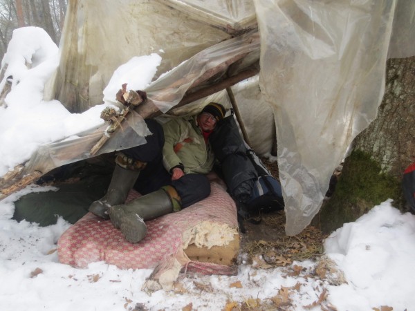 Лесной шалаш ягодников с матрасом, рядом оборудовано кострище (обнесено было пеньками) и таки ми же пеньками организовано "лобное место". Дежурить была моя очередь. Вооружившись топориком, я поскакал в лес раздобыть палок для кострового, а ребята в это время усиленно боролись за костёр.  Особо сухих дров в общем то и не было, поэтому костер сначала больше напоминал коптильню, но постепенно ситуация исправилась. К моменту готовности кострового, костер горел уже как надо. Я сильно не мудрствовал приготовил суп из.... Короче просто суп, но разошелся он неплохо, т.к. горяченького и жиденького хотелось всем (ну кроме Глаза). Вечер, за не менее интересными чем вчера разговорами, плавно превратился в утро. Надо было бы и поспасть, чем я и занялся.