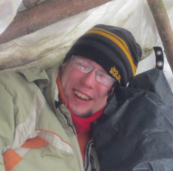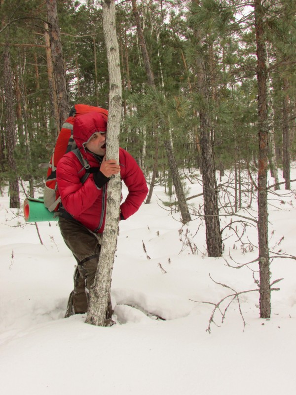 Ближе к вечеру начали подбираться к более высокой местности, метров через 500 уже виднелся целый высокий остров. Казалось бы ну подумаешь 500 метров, но эти метры до острова оказались самыми «мясистыми» в этом походе, и времени на них положили под часик это точно. «Земля становилась всё мягче, а лужи всё глубже. Меня уже перестали спасать непромокаемые гамаши, в берцах уже прикольно булькало. Миша Миндибеков в костюме «эльке» сверху замёрзший, снизу взмокший (или наоборот) из за частых проваливаний, стоял и молча обгладывал кору на какой то берёзке,а потом уже выбрал и сосёнку пожирнее.