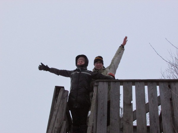 Приехав на стапель рано утром, как то очень быстро все собрались и еще в темноте под фонарями двинулись в болота. Первую часть пути до озера мы просто пролетели по хорошей дороге и по деревянной экологической тропе. Легко дышалось, легко бежалось, и по мере того как светлело, становилось еще радостнее - от осознания того , что мы всё дальше и дальше сваливает от ежедневной рутины и надоевших до коликов в печени прелестей нашей цивилизации. Привалившись на берегу озера «Большое Засоминнае», можно было полюбоваться красотами здешних мест. Ибо скажу я вам по секрету, любоваться пейзажами топая цепочкой по болотам, то ещё занятие. Многократно ловил себя на мысли «Что ж ты все в следы то смотришь? Да оторви ты очи от ног своих, да посмотри на окол!!!» Очи подымаешь, смотришь на этот «окол» и тут бац!!! Ты уже по колено в болоте – ибо нефиг отвлекать от управления транспортным средством (своими ногами) при передвижении по участкам с оживлённым трафиком (это про болото и про неизвестно откуда взявшихся 12 туристов). Так вот на этом берегу расположилась прекрасная беседочка и наблюдательный пост в виде вышки. Глаз сразу же воспользовался беседкой- решил «кимарнуть», пока мы завтракали, а Виктор Гюго прихватил Маринку и уже через несколько секунд стояли они на вышке и весело размахивали руками позируя нашему велеколепному фотографу Антохе Мощному.