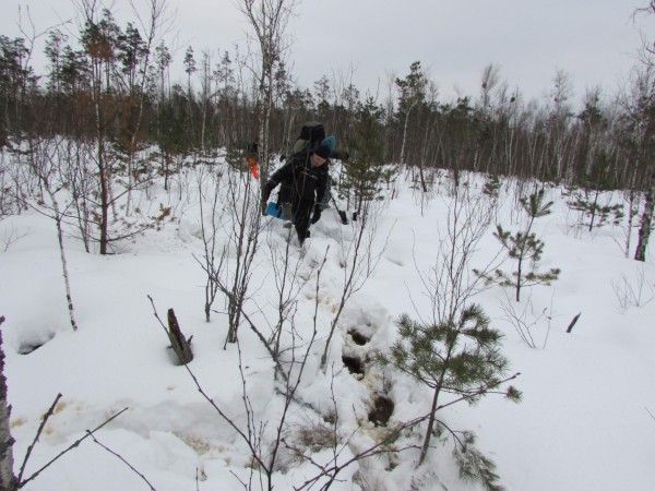 Ходовые качества второго дня были сравнимы с немецким автобаном. Мы просто неслись, чуть ли не на перегонки по натоптанной (видимо браконьерами) тропинке, поглощая километры прекрасных болотных пейзажей и вдыхая килограммы  чистейшего, морозного воздуха наполненного лесными ароматами. Шли всё так же по схеме 45. Дюны закончились, но было довольно сухо. Шли по маршруту, батарейки экономили. Иногда заходили не туда.
