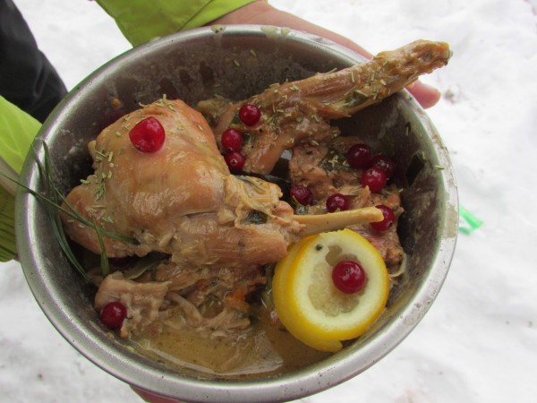 Второй день начался с кролика. Может быть не совсем хорошо для самого кролика, потому что его съели, но вот нам жирненький кролик пришёлся по вкусу. Саша Матрос устроил чендж с Бронеславом по времени дежурства и это было верное дело. Кролик был замаринован и щедро приправлен только Матросу известным букетом специй, после чего пару часов потомился в котелке со сметанным (кажись) соусом под строгим присмотром Ольки. Позже, заботливыми девчатами Олькой да Маринкой, сей кулинарный шедевр и сервировали соответствующим образом, накануне собранными дарами болотными.