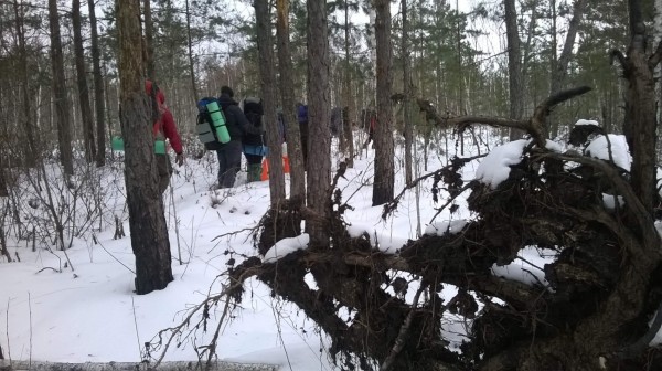 Но мы не такие, и поэтому мы слегка отдохнув от ветра начали продирать по заболоченному редколесью. Идти стало значительно сложнее. Глаз сказал, что сегодня он не выспался и тропить не может, и завтра он отработает по полной. Тропить надо по очереди, что бы не «забодаться в усмерть». Ну я начал тропить «по очереди». Очередь редела – но не расходилась. (Штирлиц). Прямого пути просто не было. Нужно было постоянно обходить деревья, завальчики, непонятные купины и кочки, хотя сначала казалось –«ну чё там, наоборот наступай на кочки да иди себе», но практика показывала, что большинство кочек были крайне не надёжными и постоянные провалы то по колено, то по самые %йца быстро изматывали. Направление держал по навигатору, до точки привала оставалось 300 метров по «показометру».