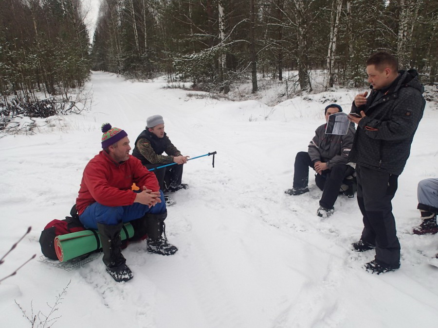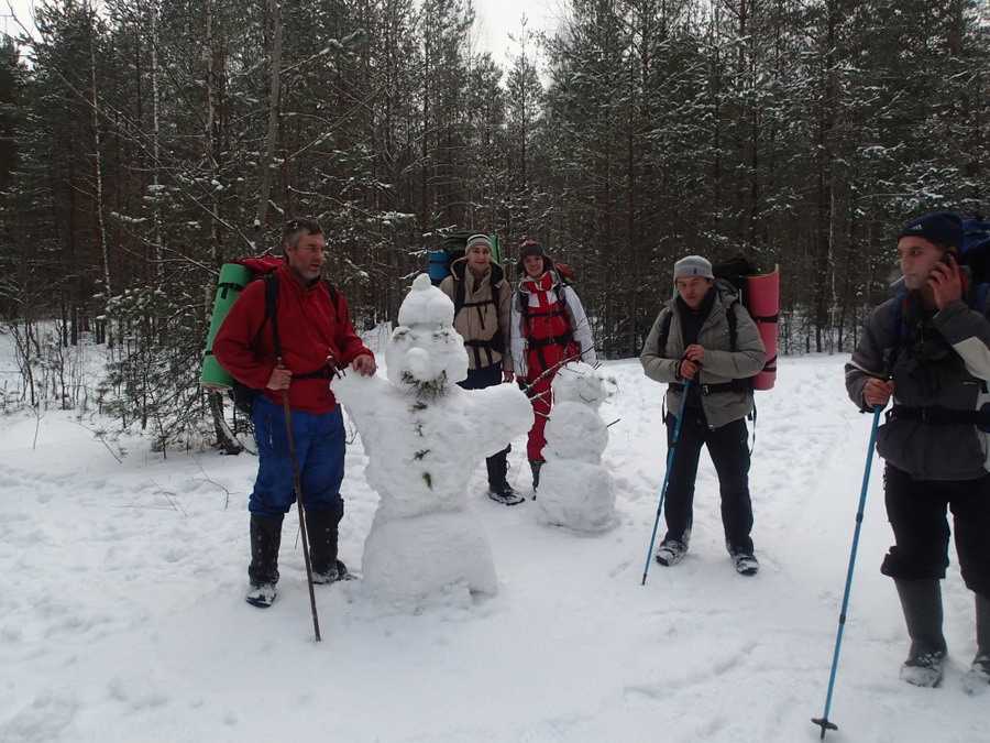 Первая остановка. Пока Волосачз бегал кругами вокруг нас пытаясь поймать связь со спутниками, ребята закусили и, узнав, что мой муж Паша работает сисадмином,  неспешно завели разговоры об интернет провайдерах,  и китайцах с их модемами. Погода была почти идеальной – легкий минус, без ветра. Не хватало только солнышка, но по прогнозам в этот день его не ожидалось. Ну что ж, связь есть, азимут взят, вместо компаса – звезды, мох и GPS, мы выходим на нужную дорогу и в путь!