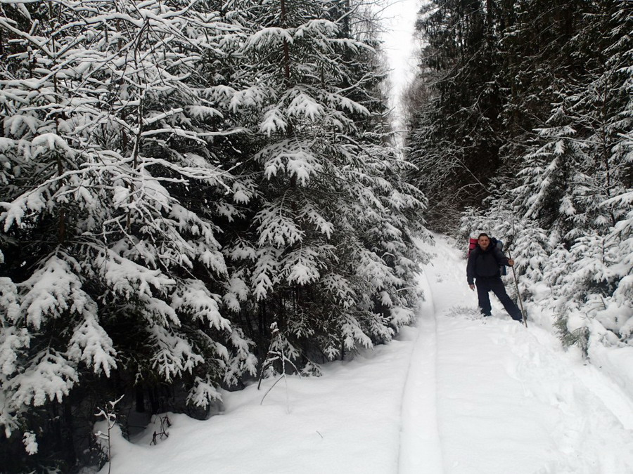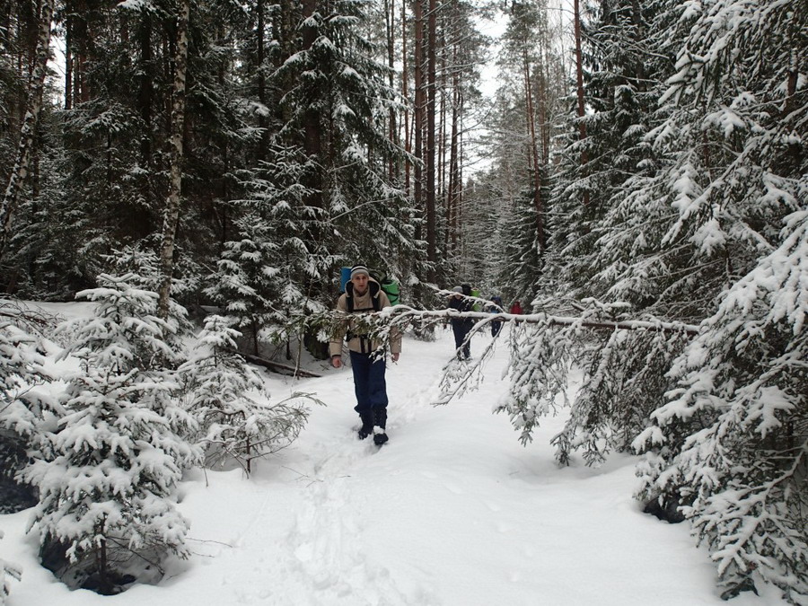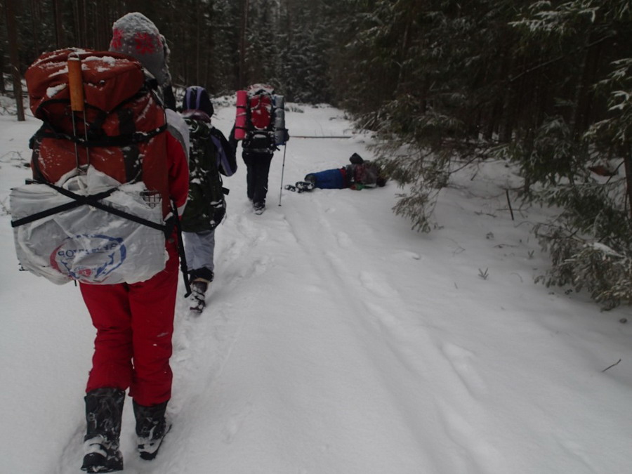 Лесная дорога оказалась коварной: под тонким слоем снега притаился предательский лед. Одни смиренно встречали его всеми частями тела,  другие изображали танцевальные па в обучающих целях, были и счастливчики, уверенно ступающие семимильными шагами 46 размера. В первый день рекорд по падениям (5 штук)  принадлежал Веселенькой Девочке, которая вынуждена была приземляться строго на пятую точку, чтобы не повредить гитару за спиной, а потом гордо восседать и ждать когда ее поднимут за шкирку, как котенка. Во второй день ее рекорд был побит с разгромным счетом Русей, но это уже совсем другая история.