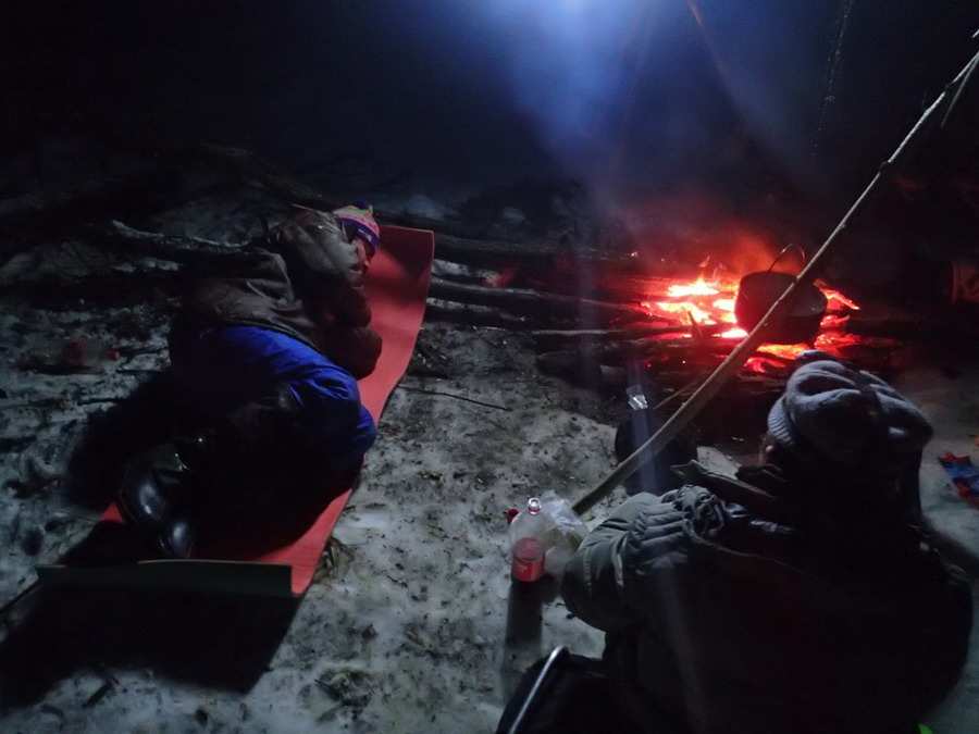 С сытым желудком, наша вылазка в лес показалась нам еще прекрасней. Вечер у костра на снегу ни чем не хуже такого же летнего. Оказывается точно так же можно поваляться на туристическом коврике у костра или даже вздремнуть у огня (правда, обязательно нужно выпить кедрового напитка перед этим)