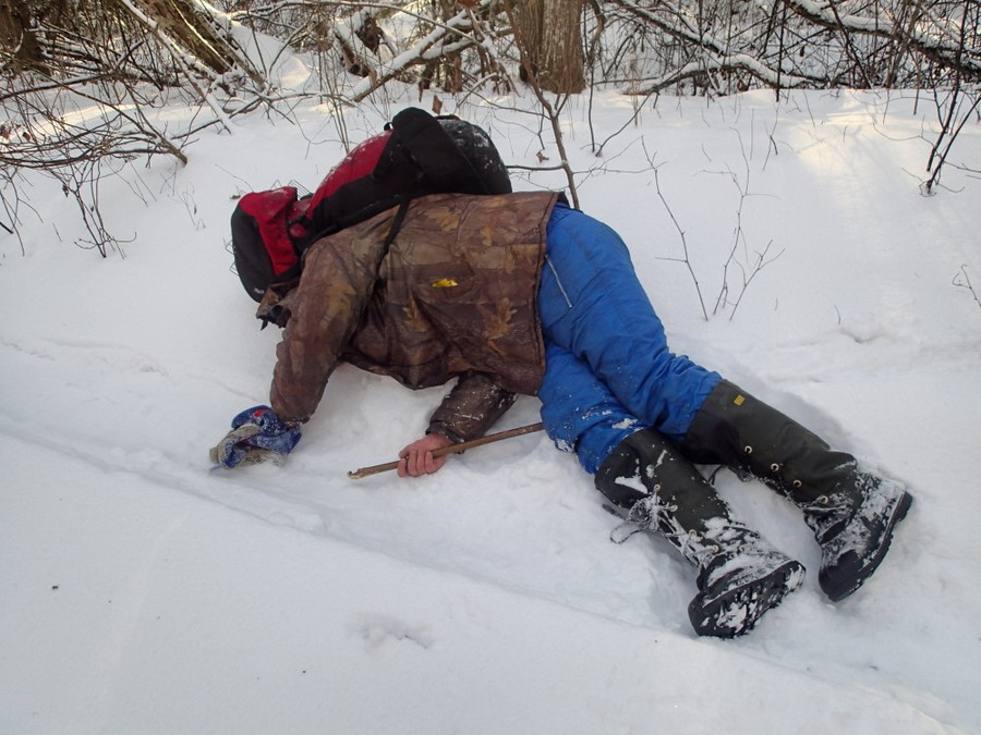 Вместе с речью пропал его осознанный взгляд и куда-то спрятался вестибулярный аппарат мозга. Андрей ушел в сумерки, по-видимому работать в дозоре. Внешне он был похож на смертельно раненного быка на корриде. С одной стороны – бык демонстрировал свою неистовую физическую силу, рюкзак он даже не фиксировал на пояснице – так фиксировать было нечем, он брал направление и бежал пока мог держать равновесие. Пробежав метров 150, Руся артистично рухнул в снег и больше не предпринимал попыток к движению. Зверь был мертв, точнее спал крепким сном.
