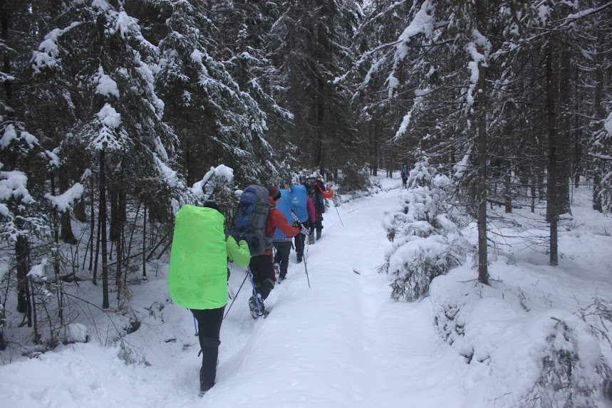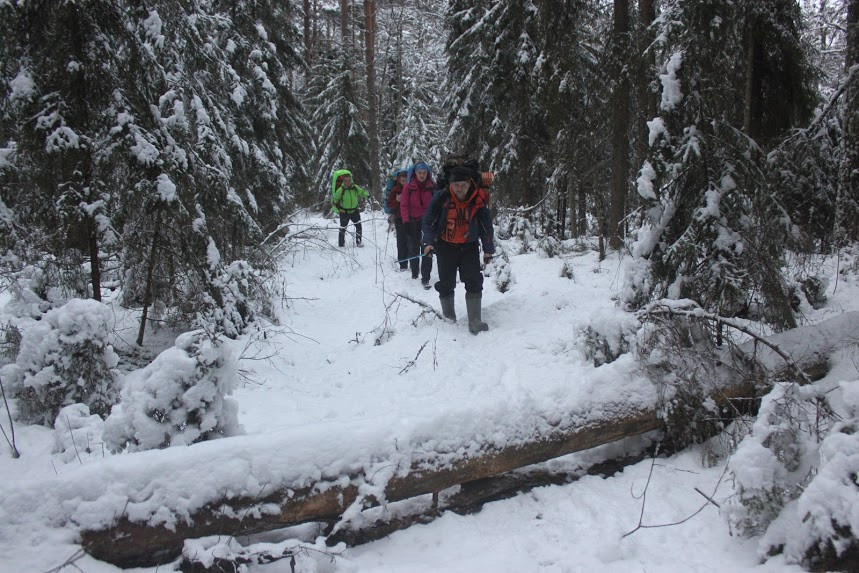 Группа поменяла свой состав. Но позитив и бодрость духа присутствовали неизменно. Снега в лесу прибавилось. И хоть лес был необычайно красив, любоваться этой красотой было довольно сложно, приходилось идти след в след и голова была опущена вниз. Это было однообразно и тяжело. Чувствовалась устлалась, накопившиеся за три ходовых дня.