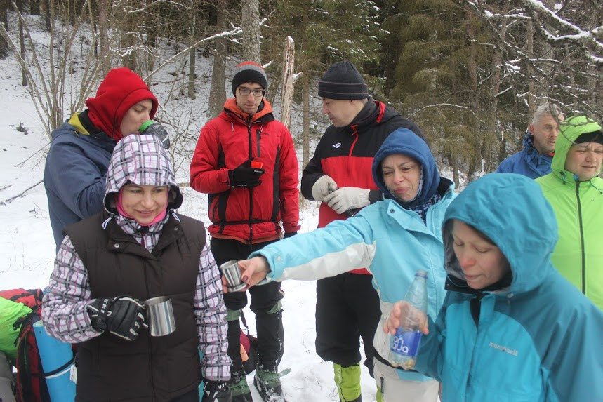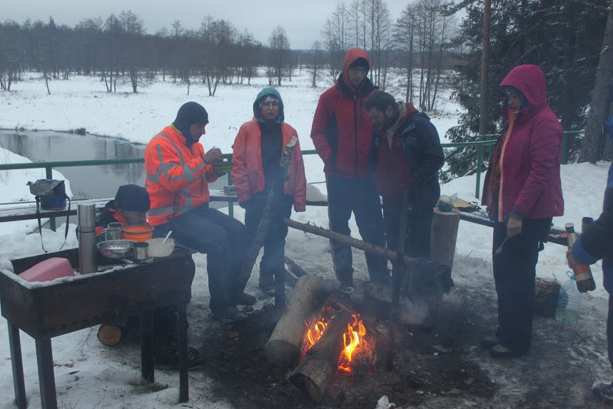 У них был параллельно с нами лыжный поход. Сделали совместное фото и пошли дальше. Лагерь расположился на берегу реки Свольна. Стоянка была оборудована беседками. Было комфортно и уютно. Приехали ребята из Минска. Ясюкевичи Ольга и Андрей. И Миша Трофимович с Женей Алисейчик. Новые люди принесли с собой кучу новых эмоций и главное наваристый борщ из утки. Принято было решение о перепарковки автомобилей чуть ближе к нашему треку что бы как немного сократить трек. Некоторые поехали решать эти задачи, а часть группы осталась в лагере.. Сергей Романовский пел без отдыха песни. Мы общались и выпивали. Спать легли не поздно.