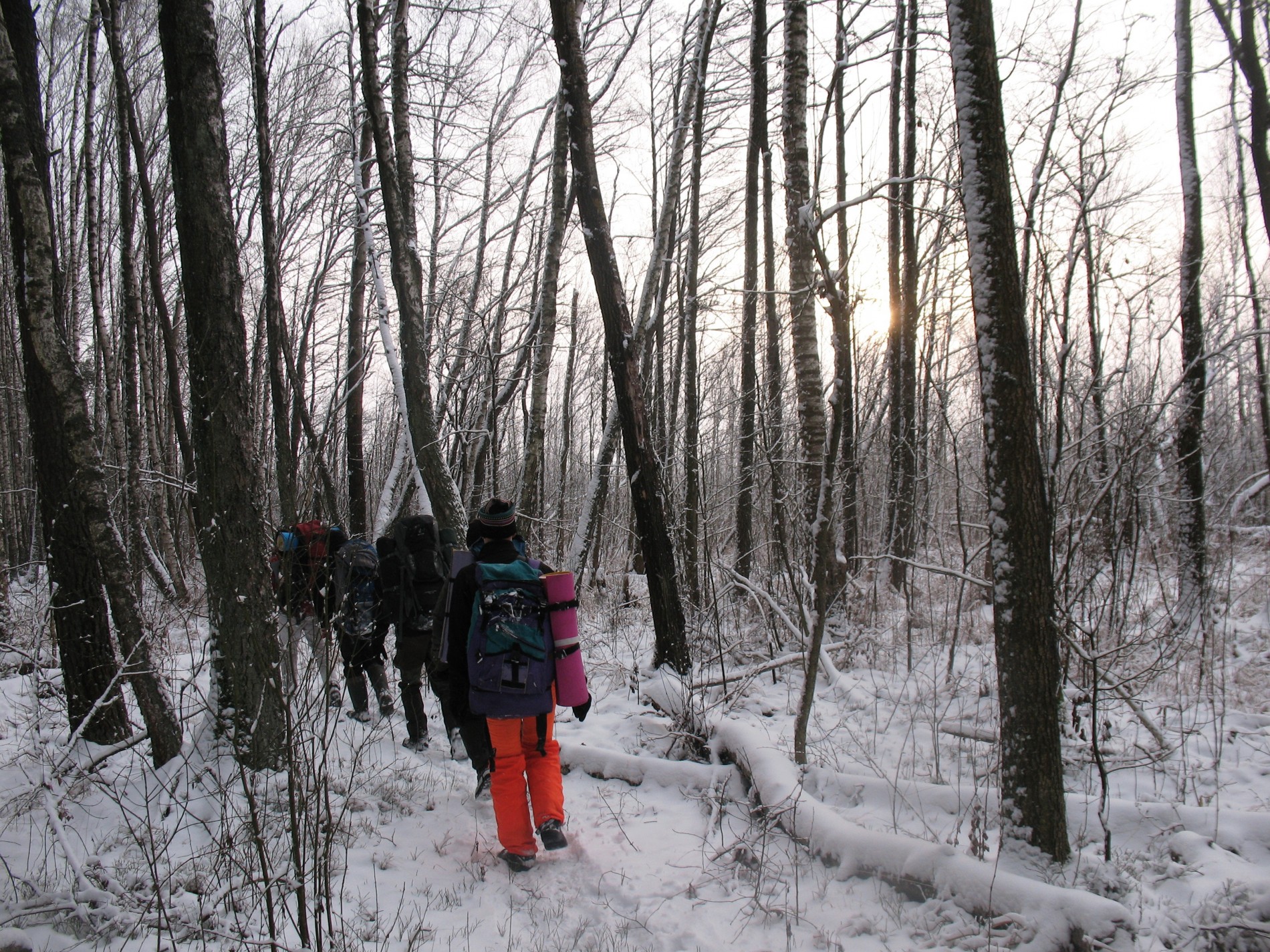 Матовое пасмурное небо. Но не скорлупа, воздух прозрачен и видимость далеко. Ни мановения ветерка и звенящая тишина в лесу. Зверей нет, и птицы не поют. Деревья неподвижны. Мороз слабый без оттепели, на ветвях тоже немного снега. Очень фотогеничные пейзажи. Межсезонных походов у нас много, а вот истинно зимних недостает. вот и приходится ловить момент.