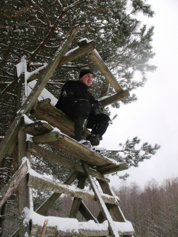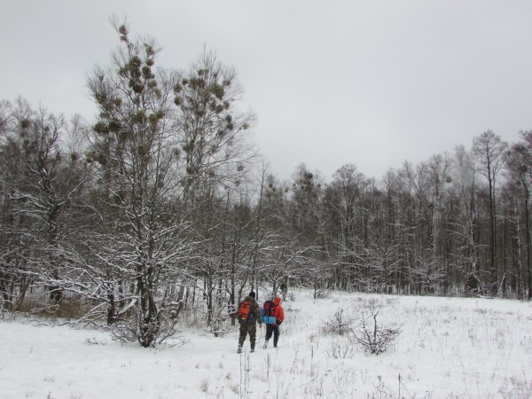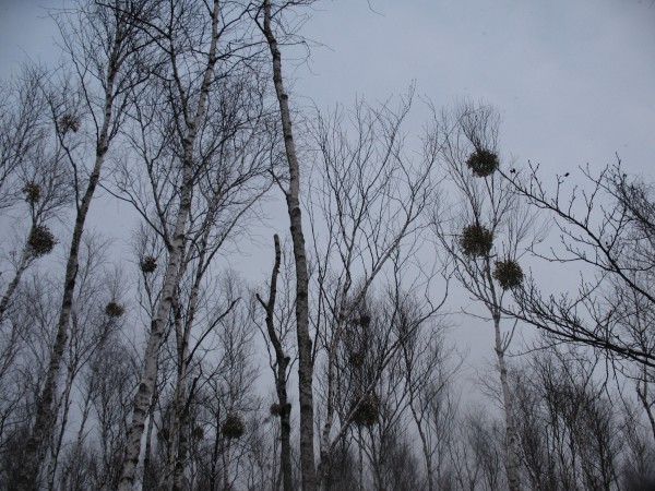 Утро 11 марта выдалось благодатным. Погода не изменилась нисколько. Не сильный мороз. Пасмурное однотонное небо, но не скорлупа, а с прозрачным воздухом. Не только солнце, даже каких-либо просветов не видно. Гробовая тишина в лесу. Ни мановения ветерка. Кроны деревьев стоят истуканами. Вокруг поляны березы увенчанные шарами омелы, словно грачьими гнездами.
