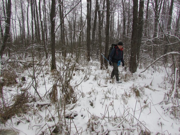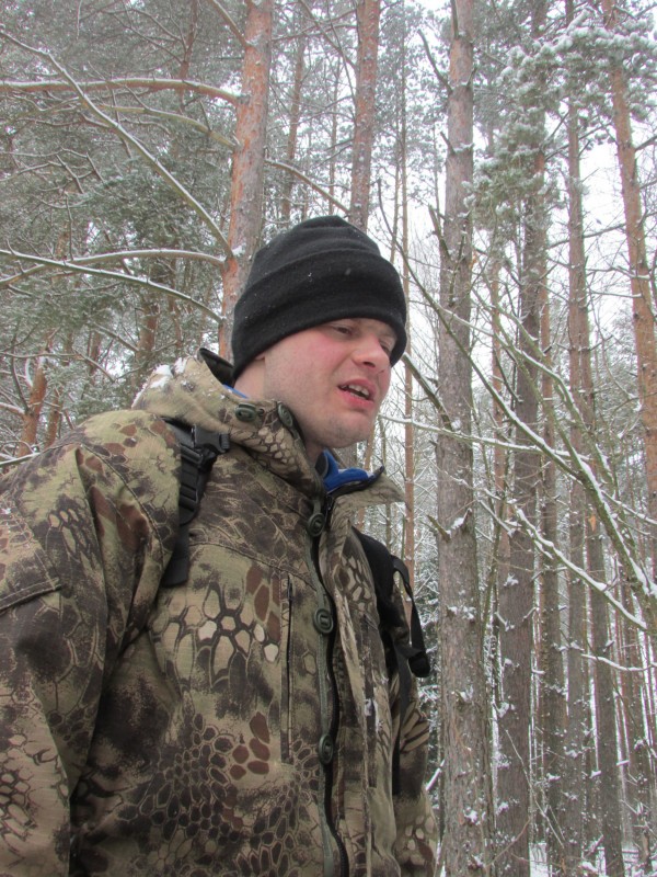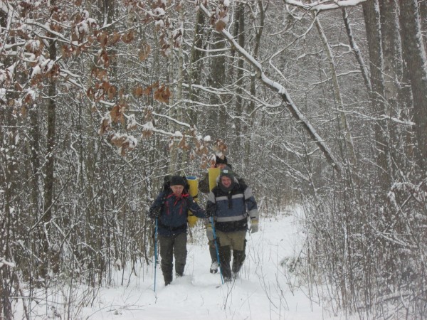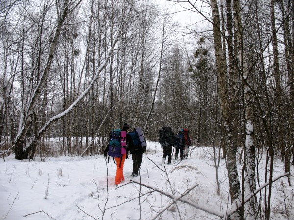 Регион. Маршрут проходил по территории земель Выгонощанского ландшафтного гидрологическго заказника. Трек в 42,8 километра (фактически длиннее) оказался исключительно динамичным. Меняющийся характер пути, рельефность и постоянная смена декораций не позволяли скучать. Получилось гораздо интереснее, нежели, скажем, унылое и физически изнурительное преодоление Болота Дулебского через обширное и бесконечное сосновое редколесье. Лесные дороги в заказнике находятся в запустении. Они прокладывались, может, еще в пятидесятых годах. На протяжении трека не встретилось промежуточных населенных пунктов. Вариантов схода с маршрута не было, кроме как возвращение или его прохождение. Значительная часть пути руководителем проекта была проложена по песчаным возвышениям «дюнам». Выгонощанский заказник – в основном заболоченные территории. За счет хорошего смерзания почвы и обилия льда, двигаться получалось легко и быстро. Но – очень скользко в резиновых сапогах. Инфантерию сопровождали постоянные многочисленные падения. Был даже один претендент непроизвольной попытки посадки одного из участников на шпагат! Пройденная территория не характерна на завалы и развитый подлесок. Из флоры (что не очень привычно для нашей средней полосы) лиственный лес: дуб, липа, клен (где выше), но в основном осина и ольха. Хвойного леса в Выгонощанском заказнике мало, сосна, елки и можжевельника не видели. Из зверья следы копытных. Но маршрут прошел без визуального контакта с животными. Стигмы присутствия грызунов – зайцы, бобры. Птиц в это время в лесу не обнаружено.