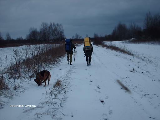 Мы с Носатой Леной шли впереди. А пройти нам предстояло 47 километров. Небо затянуло и пошел снег. В стороне светились дрожащие огни печальных деревень. Насыпь здесь была не очень заросшей и продвигаться можно было быстро. Рома с Андреем и Артемом шли где-то сзади. Их можно было определить по шатающимся фонарям. Бежала собака, то догоняя нас, то возвращаясь. Было прикольно, только мне хотелось пойти быстрее. Так и вошли в лес. Свои семь километров мы прошли и разбили лагерь недалеко от линии электропередачи. Снега было мало, и идти пришлось за водой к каналу. Канал не торфянистый, вода чистая. Сырые березовые дрова разгорались очень неохотно, дым змеился и пытался выедать глаза. Я за ужином присвоил себе лавры, будто сам испек рыбный торт. Мы с Леной поставили палатку. Рома и компания ночевали в каких-то вигвамах. Ситуация развивалась планомерно.