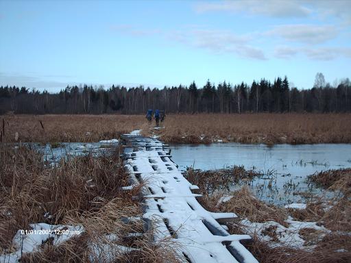 В деревне Заберезцы живет зимой только две бабушки. С помощью этих бабушек мы нашли тропу, которая вывела нас на кладку, а вернее на длинный помост через болото и реку Шать.
