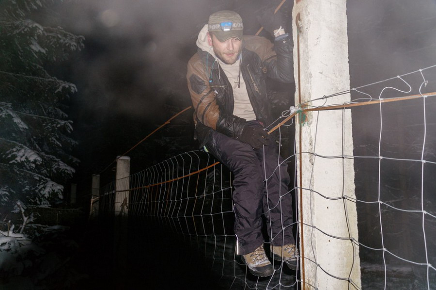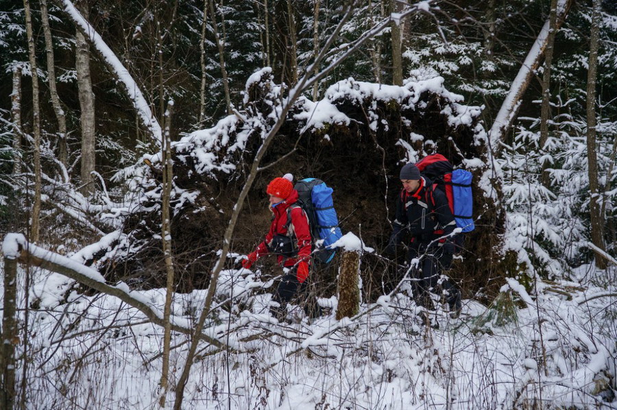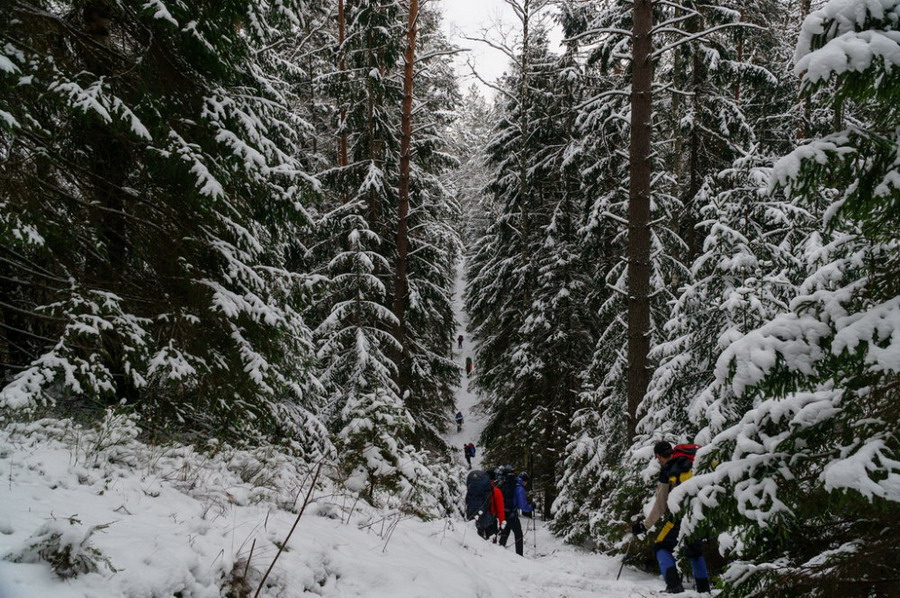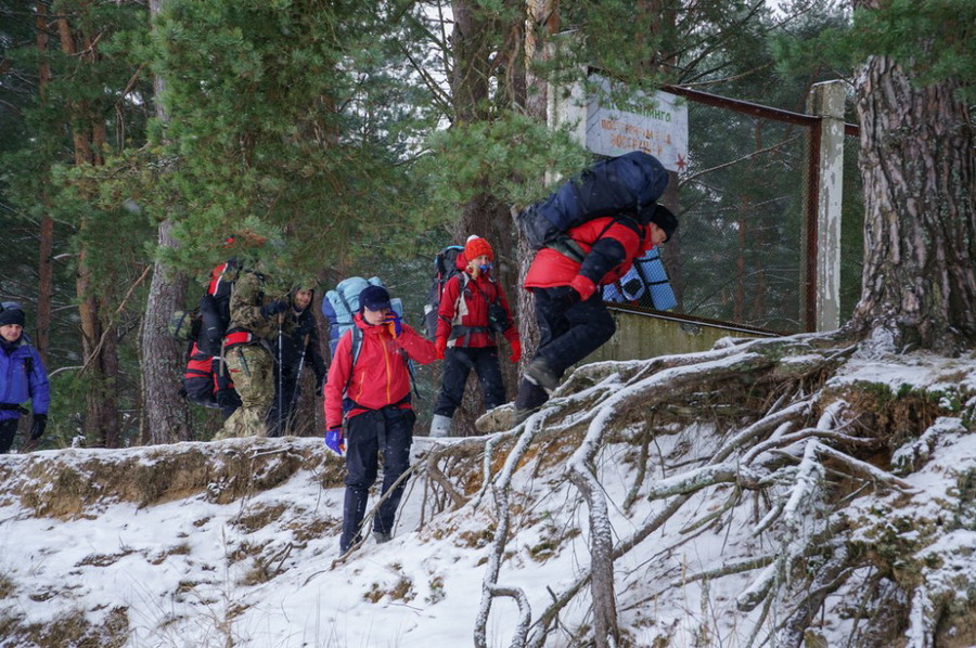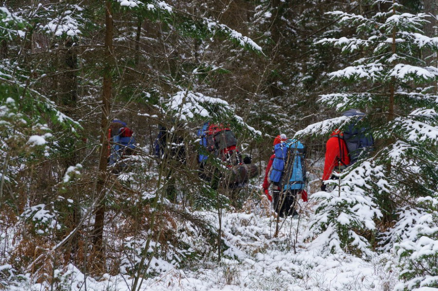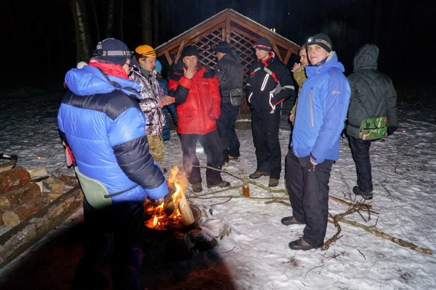 Стартанули бодрые и готовые пройти сколько угодно километров. День выдался веселый, я ооочень давно не была в лесу, поэтому шла зачарованная… лесом, компанией... одним словом – сказка. Много шли по просекам, утоптанным тропам и хорошим дорогам. Но думаю для всех самый интересный и сложный участок оказался в конце дня. На пути выросла ограда, которой не оказалось ни на одной карте. Пройдя вдоль неё стало понятно, что конца края ей нет. Появилась идеи о преодолении «напролом»,  рассматривали варианты «перекинем Лену (т.е. меня), если арматура под напряжением, то знаем её недавно, привыкнуть ещё не успели »,  даже глазом не успела моргнуть, как через минут 15 все оказались за забором!, вероятнее всего на территории «диких зверей». Настораживала фраза «говорим тише, если разбудим медведя, то собираемся кучкой и медленно отступаем» Фух… Благо оптимизма не убавилось). Ииии… начался бег с препятствиями. Теперь понимаю, что такое «Магадан» - НАМ СЮДА!!! Бурелом, кочки, бурелом, сугробы, ветки по лицу, кочки, темно, снова ветки, бежим за Ковальчуком Сергеем, он обнадеживает фразой «через 200 метров забор» и убегает . В какой-то момент я уже даже потерла впереди Ольгу и только прыгала за огоньком фонарика через ветки. И снова «о!!! осталось чуть-чуть! Через 200 метров забор!» - и снова рулевой убегает. Ну и скорость же у Сергея!!! И это не все прелести первого дня! Нас ждал сюрприз: вечером баня и глинтвейн – светло и тепло!, утром – к нам присоединился Миша Трофимович.