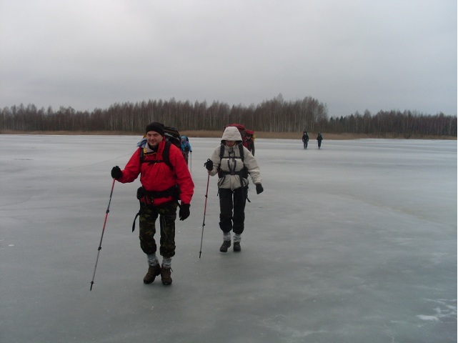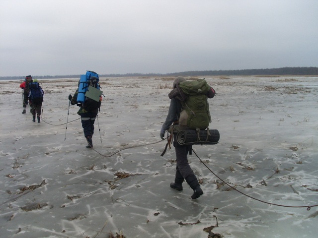 На берег вышло 10 человек. Несмотря на то, что лед был достаточно толстым решили в рамках тренировки связаться. Через озеро прошли клином. Озеро оказалось большим и неопасным. Вышли на берег, стали снимать обвязки, когда Смирнов обнаружил, что перешли мы не Сергеевское, а всего лишь какое-то болото, Сергеевское же оставалось впереди. Рассудив, что Русьяновщина может сесть отмечать переход через водоем и чрезмерно задержаться, решили предупредить их по рации. В ответ возмущенный Глаз разразился тирадой: «Что значит, обнаружили? Это болото, за ним торфяник, потом – Сергеевское! Продолжать движение!»