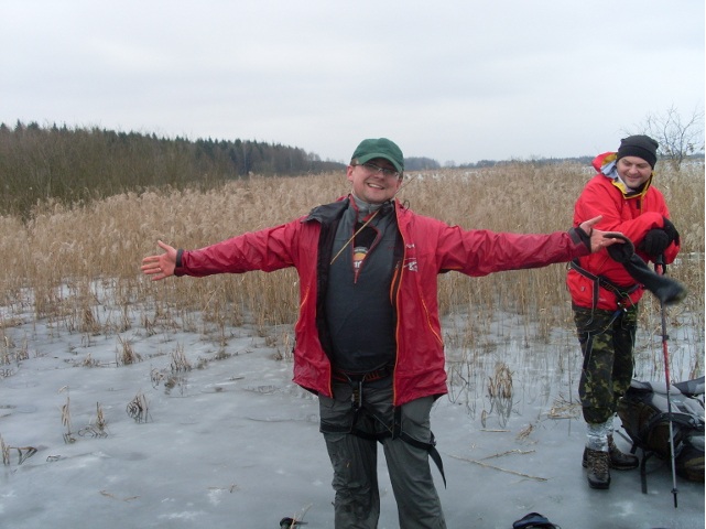 Шлось легко. Узкие каналы разворачивались в озера, затем снова смыкаясь в каналы. Люди растянулись по треку. Впереди шли Смирнов и Веселая Девочка. Они пели, периодически подтанцовывая при помощи практически ненужных палок. Я догнал их и был принят в компанию после совместного исполнения пары куплетов. Затем Смирнов вдохновенно исполнил заглавную песню из Титаника и мы оказались у полоски открытой воды, в обе стороны кот которой простирались заросли. Смирнов неторопливо двинулся в обход, вошел в заросли, почти сообщил, что перешел разлом и провалился в воду по пояс. Первым на помощь ему, не растерявшись, двинулся Андрей Потапов, весящий без рюкзака 125 кг. Рюкзак он, однако, предусмотрительно прихватил с собой, что привело к тому, что в купании стали участвовать уже двое. Остальные не торопились разделить это развлечение, сбросили рюкзаки и аккуратно начали протягивать купальщикам палки. Смирнов вылез первым, затем извлекли Потапова.