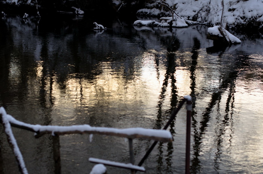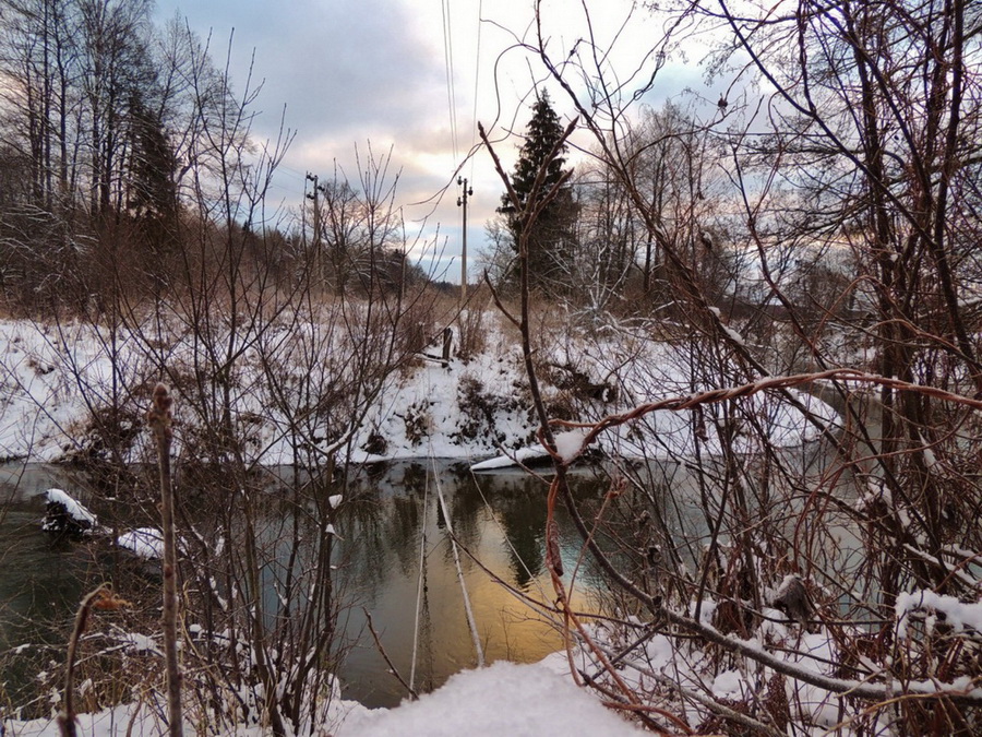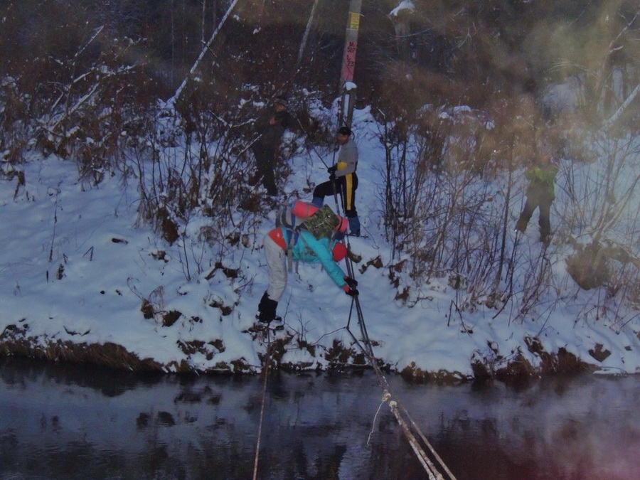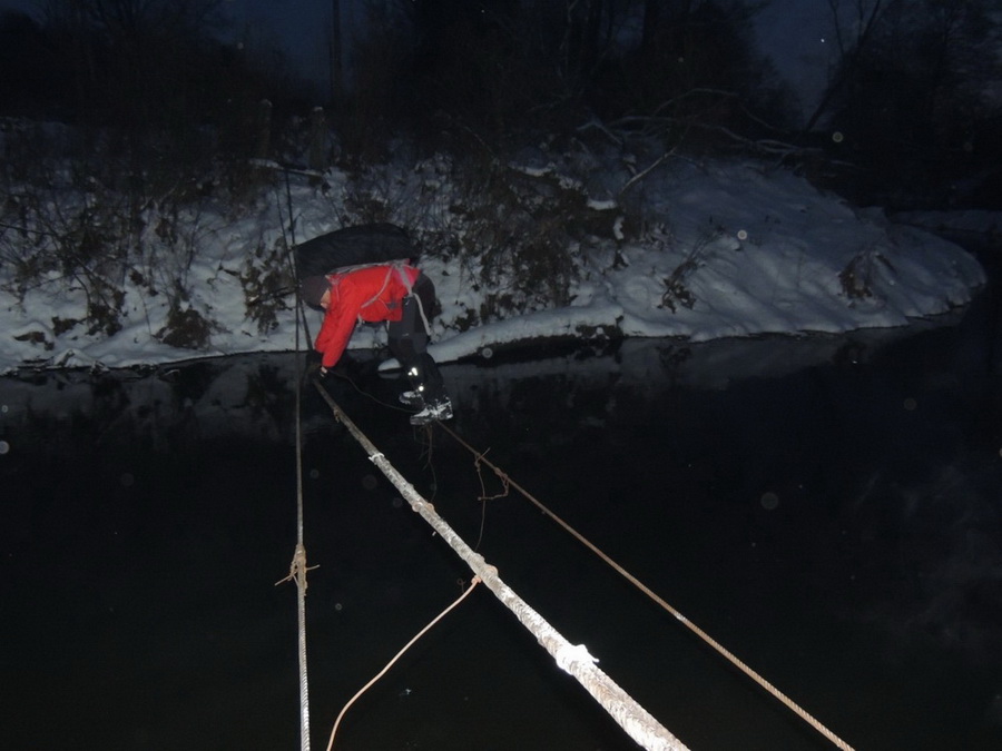 Дело шло к вечеру, а впереди был еще один переход через реку. Несмотря на неоднократные предупреждения о возможном отсутствии подвесного моста, группа резвой рысью подбежала к реке и... моста конечно же не было. Вместо моста через реку были натянуты тросы, по которым Миша тут же бодро перебежал на противоположный берег. Прочие участники похода Мишиной бодрости не разделяли и на тросы посматривали с опаской. Некоторые всерьез рассматривали перспективу преодоления реки вброд. Однако Ислочь здесь уже делается достаточно настоящей рекой, широкой и, по-видимому, глубокой, чтобы преодление ее вброд даже летом, не говоря про зиму, было затруднительным.