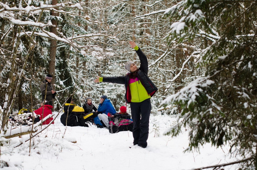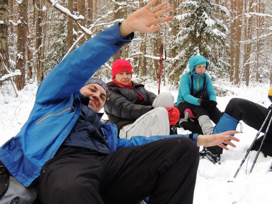 С первых же минут стало очевидно, что эстетическая составляющая похода будет на должном уровне: заснеженные деревья, река, легкий мороз... природа определенно располагала к себе туристов. А туристы были расположены позавтракать: то ли природа сказывается, то ли ранние выезды, но в начале походов впечатление складывается такое, что гастрономическая составляющая превращается едва ли не в основную на маршруте.