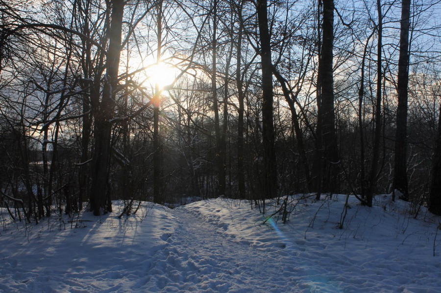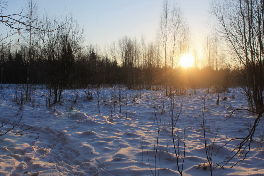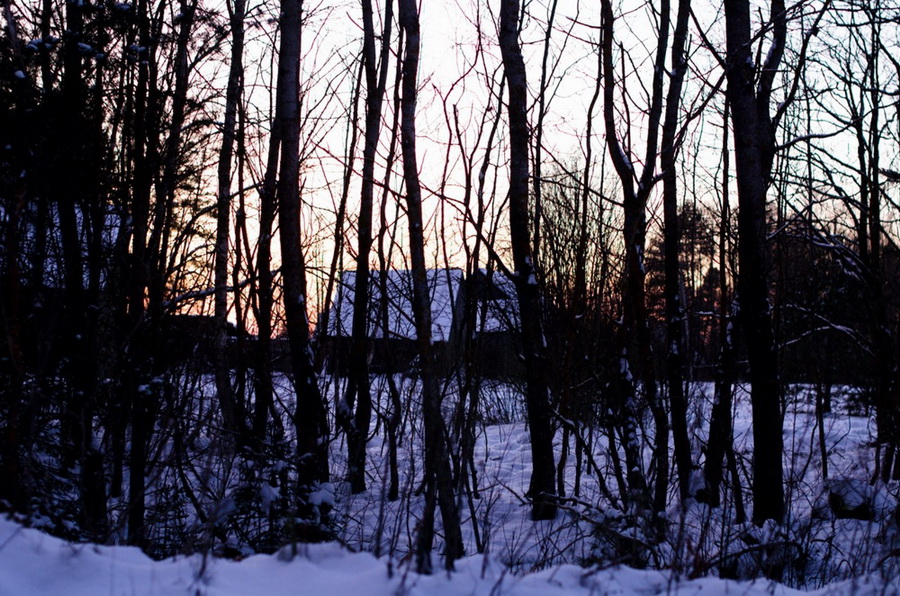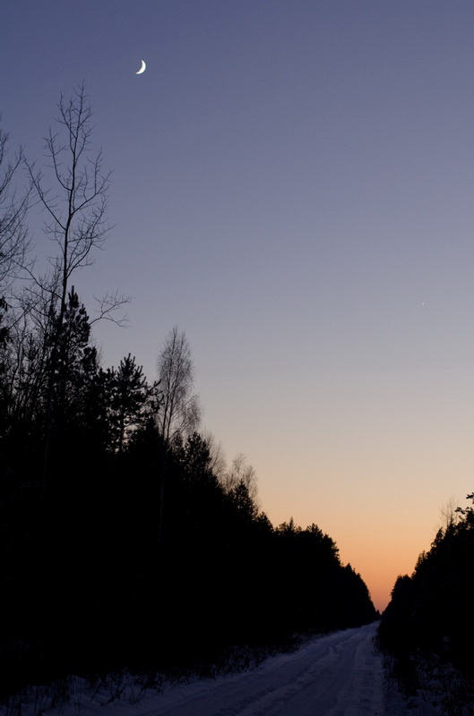 Начинало вечереть, всё сильнее чувствовался мороз, над полем и лесом багровел закат и повис уже в ясном небе серп месяца.