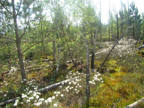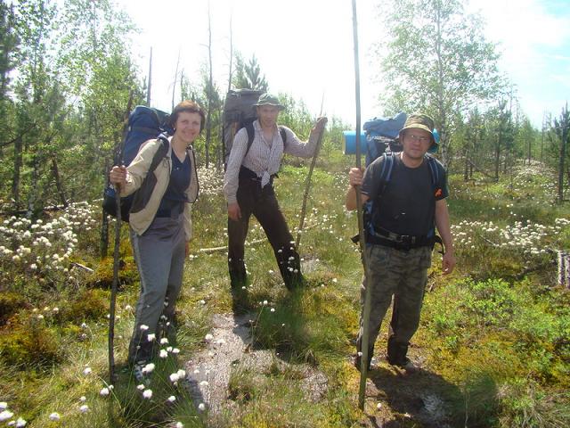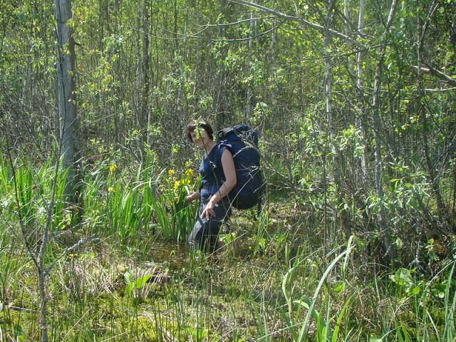 В 9 утра на станции Верхи я увидела своих попутчиков. Они вчера слегка промахнулись , электричка здесь не остановилась на нужной станции и пришлось вечером пройти по шпалам 6 км. Маршрут был проложен по пересеченной местности. Пересечена она была 4 каналами и рекой. Сплошным ковром стелились белорусские болота. Никогда не думала, что пойду по болоту и очень обрадовалась. Однозначно не попсовый маршрут. Горожанин старается ножки не намочить и грязь обойти, служит своим дорогим туфлям, а в лесу одежда и обувь служат человеку. Такие мысли появляются, когда опускаешь белые кроссовки в болото и оказывается, что это удовольствие Из подсознания выползло радостное ощущение от изучения свойств грязи. По началу продирались через заросли. Болото гудело--репеллент помогал но не спасал полностью. Первый канал был по колено, второй, самый чистый и теплый, до бедра. Время похода оказалось вполне удачным: вода уже не холодная, но еще не жарко. Пить очень хотелось, вода казалась очень вкусной и быстро расходилась. Нагрузка оказалась сбалансированной: каждые 1,5-2 часа выходили на сухое и чистое место. На стоянке сделали вывод, что самое главное в болоте вода и репеллент. Время от времени выходили на лосиные тропы. Животных не встретили даже лягушек мало и маленькие росточком, певчих птиц не много.