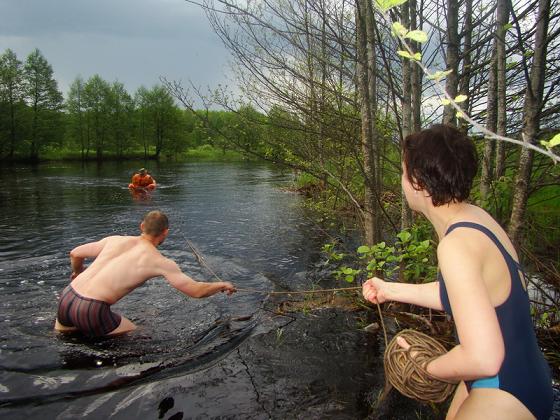 По широкой и ровной лесной дороге мы шли, как моряки, сошедшие с корабля, удивляясь, что ничего под ногами не шатается и не проваливается.  Стало легко, и можно было поговорить. Обсудили планы  дальнейших путешествий, и пришли к Птичи. Старый мост, еще обозначенный на карте, уже разрушился. Мы снова надули лодочку. Веревки не хватало, чтобы переправить ее от берега до берега. Я переплыла речку и невдалеке от противоположного берега обнаружила мель. Леша отправлял мне груженую лодку ,  а я сматывала веревку и тянула лодку на берег, тем временем он  приплывал и помогал мне  причалить к берегу изрядно снесенное течением суденышко.