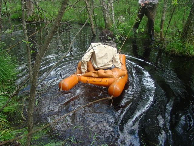 После форсирования  второго канала потревожили гадюку на кочке;  удалось расстаться мирно, однако ступать стали осторожнее: вдруг  их тут много. Метров через 20 нашли гнездо с яичками на кочке, думаем куропатки (кто знает точно, подскажите, пожалуйста). Подкрепив силы обедом и последней водой, вскоре попали к третьему каналу, который впадает в озеро Гремячее. Он широкий метра четыре и глубокий. Надули лодочку, привязали две веревки и начали переправу. В лешиной  голове нарисовался нестандартный новый маршрут:  проплыть по этому каналу на каяках. Тут я поняла, что Леша—Художник, а мы посещаем его занятия (сегодня, похоже, по болотному  авангарду).  Записывайтесь кому интересно.