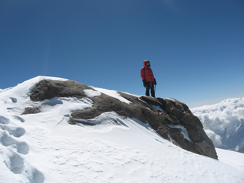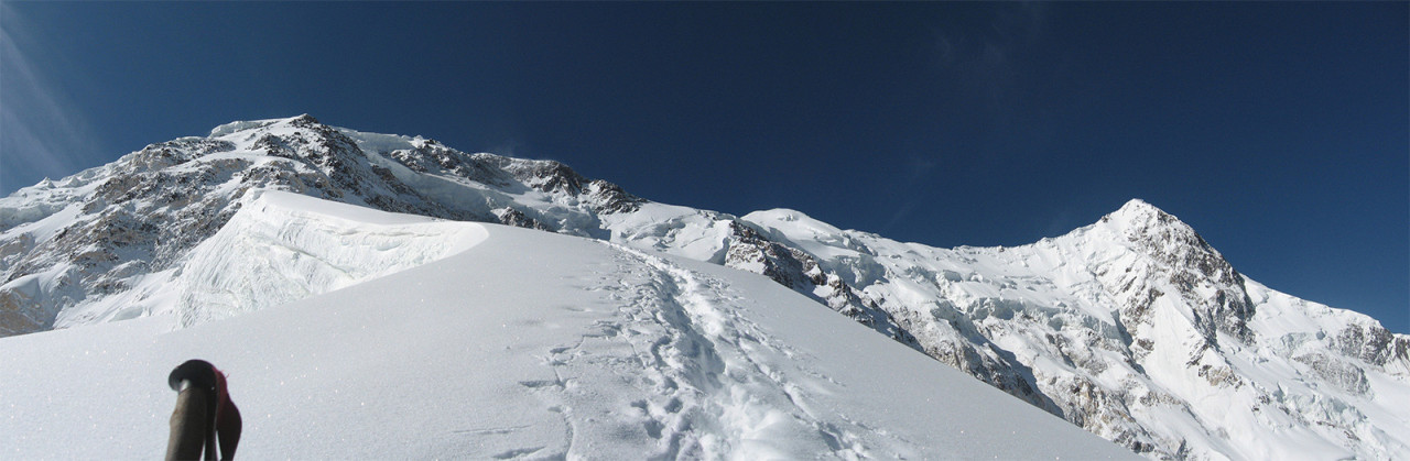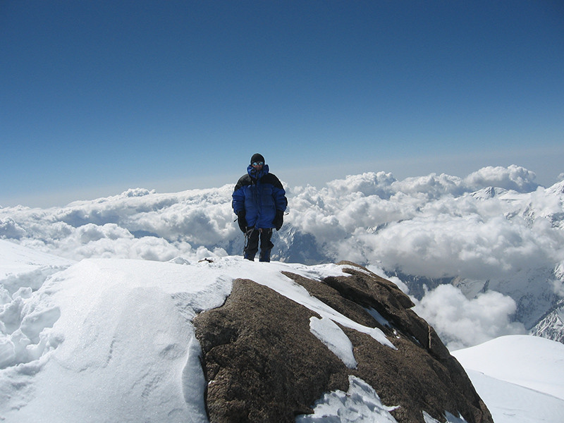 Утром всё гнало нас вниз. Погода испортилась, висела облачность, дуло. Отказала последняя зажигалка. Пришлось просить у эстонцев. Пока собирались, подошла четвёрка бородачей, спросили сколько до Обелиска, и узнав, что 15 минут, заторопились на восхождение ловить последний шанс. Когда вышли, облачность рассеялась, но осталась лёгкая метель и мороз. Два раза останавливался, манипулируя с одеждой, одел горнолыжную маску. Догнал Максима на вершине Важи. Склон был заметён и опять лавиноопасен. Начали аккуратный спуск. Дальше камни, лёд, перила, народ, подымающийся вверх. Ниже 6500 опять вошли в облачность, здесь температура положительная, но высокая влажность, подлип. Кажется, и спускаешься, и дышится легче, но когда все силы оставлены на горе, теперь уже просто дорабатываешь в том темпе, который у тебя есть. Забрали заброску на 6300. Встречные уже узнавали нас, сразу поздравляли. Некоторое время "Беларусь два", наш позывной, была на слуху.