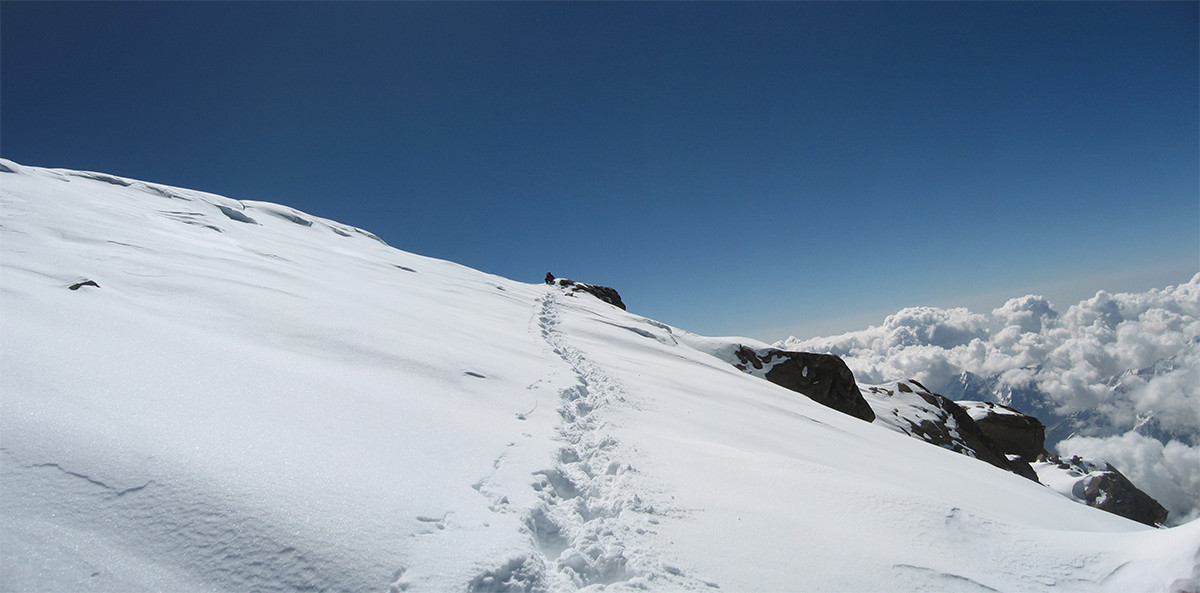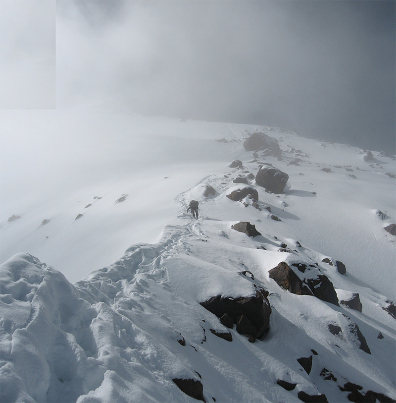 Утром палатка была заметена наполовину, а в окрестностях, не осталось не одного следа. Отсутствие видимости замыкало в пятидесяти метрах пространства. Собирались молча. Понятно, что тропу придётся восстанавливать по памяти, гидов нет. Есть, конечно, ниже вешки, но с такой видимостью можно запросто проскочить мимо и выйти чёрт знает куда. Надежда была на острое зрение Максима. Пошли не спеша и осторожно. В общем, мы только два раза отклонились и возвращались и то незначительно. Когда откопали первую перильную верёвку, я сказал Максу, чтобы он свалил весь возможный снег со склона. Сначала он спустил лавину прямо, вторую слева, более-менее, расчистив спуск. А сыпало по сторонам. После перил включили возможную повышенную скорость и пересекли на спуск молча склон. Выдохнули и остановились только на леднике. Было уже 12 часов, мы отставали. Ниже на леднике обнаружили чьи-то свежие следы. Шли вниз уже по ним. Отчаянный одиночка рискнувший пройти ледник.