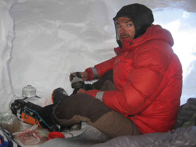 Расположились, разложились, оставался ещё час до связи, который использовали для отдыха забравшись в спальники. На 18 часовой связи выяснилось, что расположились мы в пещере которую вырыл Дмитрий Павленко, и что хозяин подымается и будет в ней ночевать. Начали расширять пространство для третьего человека. Раскопали вширь и начали готовить ужин. Тут пришёл Димон, ник такой на Риске, наша работа его не удовлетворила, и он занялся реконструкцией. Максим помогал, я остался при кухне. Димон вырыл сбоку нишу, потом заделал частично вход. Когда в пещере оказалось трое человек места действительно стало мало, особенно если учесть две кухни. Димон готовил в нише, а мы на нашей части пещеры. Вид Павленко говорил о полном неприятии соседей, ну а нам как-то хватало привычного общества друг друга. У нас по раскладке был гороховый быстросуп. Пища не для высоты, но менять и корректировать ничего не хотелось. То ли от усталости, то ли от смущения, но Максим неосторожным движением столкнул кастрюлю. Он поймал её почти на лету, но половина супа пролилась, причём часть на коврик Димона. Недовольно ворча он ликвидировал аварию рулоном туалетной бумаги, мы, не особо отвлекая внимание, ликвидировали свою часть пролива. Так мы окончательно попали в разряд "детей" или жутких новичков, которых кто-то притащил на Важу в чужую пещеру. Потом снаружи началась метель, все уснули сразу и без разговоров. Ночью Димон вылазил на выход, потом вернулся, ещё час поспал, собрался и ушёл.