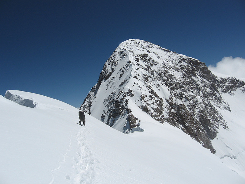 Потом гребень начинает набирать высоту и угол, тут уже не встанешь. И если после перевала ещё есть пару разрывов, то теперь трещин нет и идём по следам иранцев. Через 40-45 минут отдых, снимаем рюкзаки. Обходим смешанную двойку.