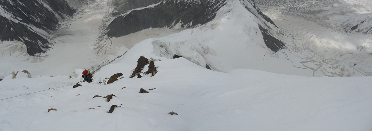 На почти вертикальных участках перила надёжные, лёд под снегом, приходится жумарить. По плану у нас лагерь на 6100, и мы упорно приближаемся к этой высоте.