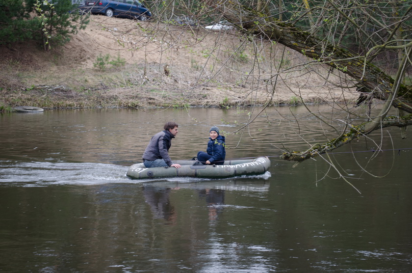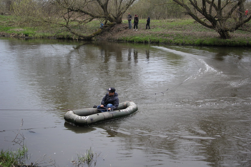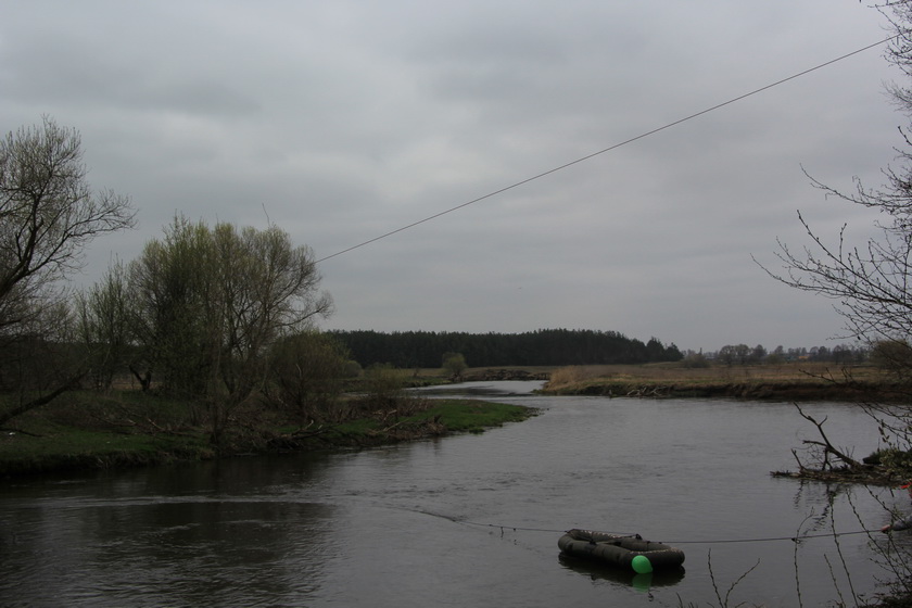 Мутная вонючка-Свислочь бодро производит здесь левый поворот. Раньше справа был улов с обраткой. Но за годы вода размыла русло как-то по-другому. Деревья были голы пока еще совершенно. Почки же на них набухать начали едва-едва. Зеленая трава показываться стала своими вострыми перьями только-только. В воздухе висели жгуты проводов гигантской электромагистрали. День тот 13.04.2014 выдался не холодным, но относительно прохладным.