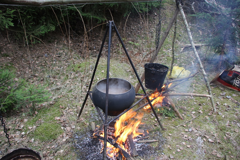 С правого берега имелась рукотворная силосоподобная яма. В дно оной не вбивались совсем колья. Мы расчистили землю и мох и увидели, что дно забетонировано. Требовалось соорудить как-то хоть стол. Паленый с Руссиановым путем многократной шнуровки палочек и перекрытий все-таки справились в условиях ограниченного времени.