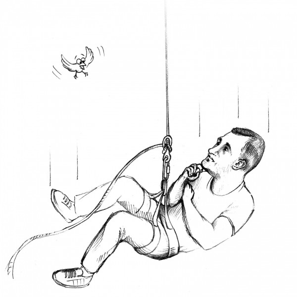 Спуск проходил по новой скользкой веревке небольшого диаметра, на которой восьмерка не давала достаточного трения. В итоге, проехав больше половины спуска с помощью силы рук, Саня преодолел оставшиеся 7 м в состоянии свободного падения (вероятно сила внезапно отключилась). Не помог даже схватик, заботливо завязанный товарищами, за который наш экстремал держался рукой. Зато помог давний совет отца-десантника при падении смотреть выше горизонта. И к счастью обошлось без телесных повреждений. А Саня проделал весь путь заново, но с учетом полученного опыта.