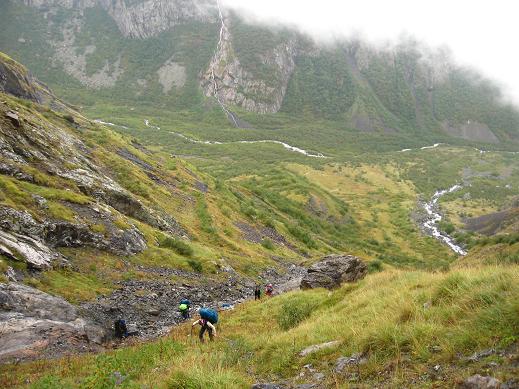 Коллектив был несколько растерян и не знал, куда себя приложить. Слонялись по лагерю. S.klim с Глазом нашли шапку грибов. Старые подберезовики и рыжики. Рыжики были квалифицированы большинством, как волнушки и тотчас немедленно выброшены вон. А над старыми подберезовиками еще раздумывали, их в пищу подбросили украдкой, неофицильно.Ходили на экскурсию к водопадам. Ущелье Мидаграбиндона ими буквально плачет. Один ступенчатый – низвергается на 700 метров, считается самым большим в Европе. Как за день ледники нагрелись солнцем, водопад наполнился, стал более мощным и седым. И это все было перед нами.