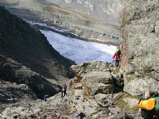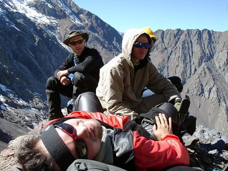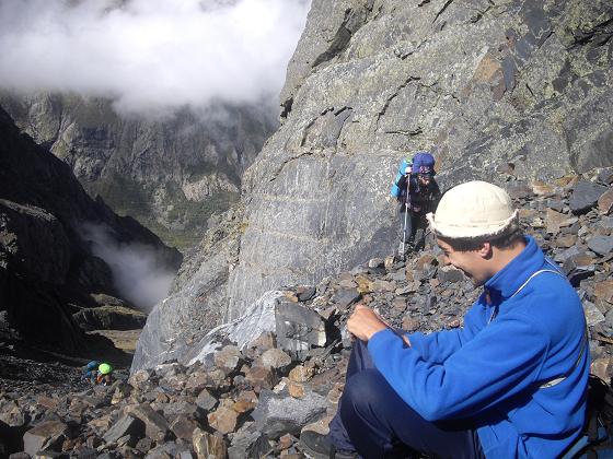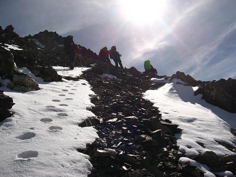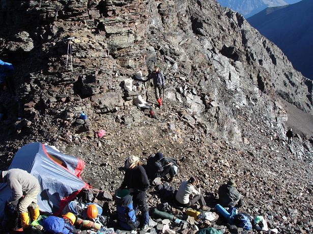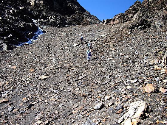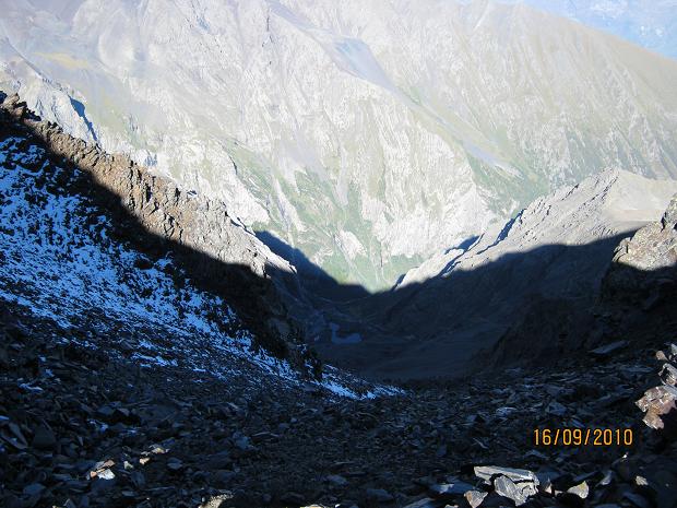 Вот уже десять часов мы лезем на перевал и до сих пор не видим его седловины. Дело клонилось к вечеру. Воды нет. Жуткая жажда. Уже не согревало солнце. Оно вскоре собиралось скрыться за соседними хребтами. 3600 метров высота по приборам. И нет больше сил набрать эти оставшиеся 300 метров. Невозможно двигаться большой и плотной группой. Мы сыпем друг на друга камни, кроме того, они летят и без нас из дочерних щелей. Есть такие опасные сужения, что спрятаться решительно негде и этот участок просто нужно быстро проходить.