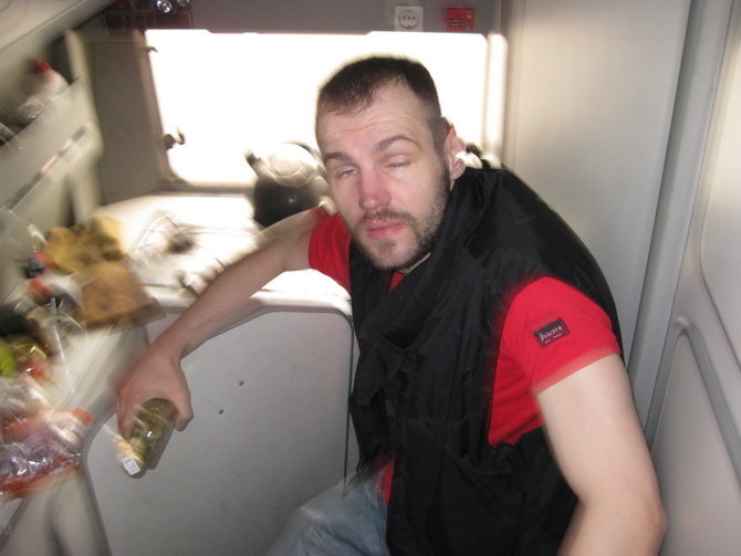 Кто выступал в поход знает, как возбуждающе может действовать дорога. В плацкарте, тем не менее, вести приходится посдержаннее, но не в «Веселом Бусе». БухБус у Максима не так давно, зато эксплуатируется очень активно, причем не только мотается по дорогам, а используется и как место проведения пьянок. Иногда и то и то вместе одновременно. Большой бус, похожий на шкаф или рефрежиратор продвигался сегодня со скоростью 75 км в час на юго-восток в сторону города Брянск. Шумноватый низкооборотистый двигатель урчал. Пахло едой, водкой и немного нефтью.