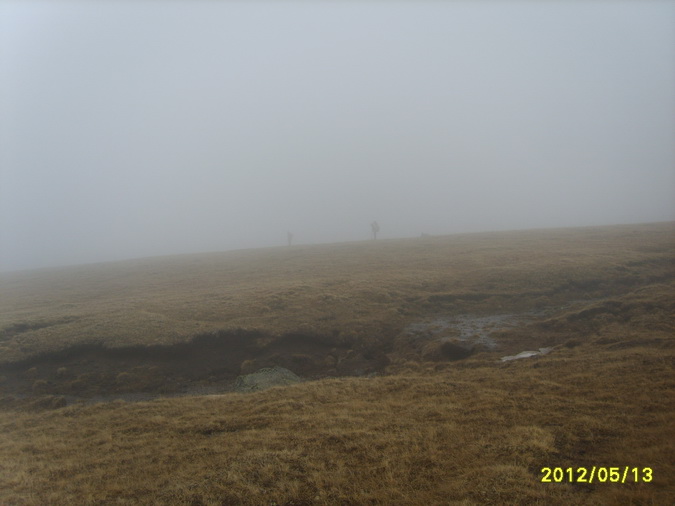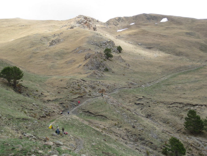 Посидели и пообедали мы вовремя, поскольку когда свернулись и готовы были идти дальше, пошел дождь. Дождь был не то чтобы спорый, но уже шел со степенью навязчивости. Мы шли по сформированной четкой тропе. Потом соеденились два равносильных ущелья. Появились сосны. Тропа шла траверсом по крутому травянистому склону. Потом стала теряться. Пришлось спускаться вниз к ручью змейкой по произвольной траектории.