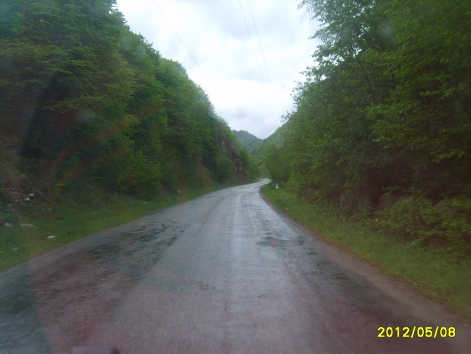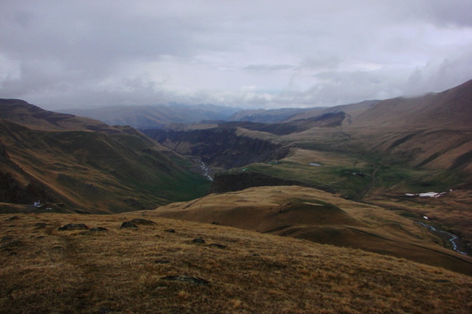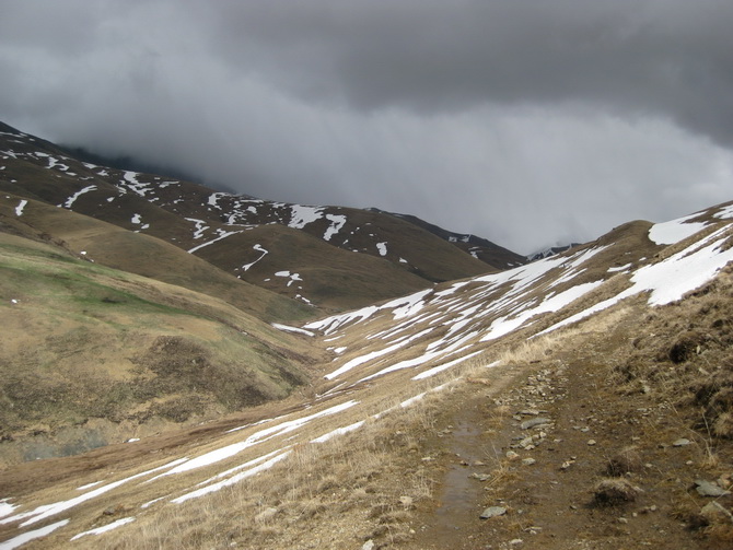 Время примерно было после обеда. Выходить не хотелось. Пошел как раз дождь. Даниял заверил, что якобы такой на долго. Надели рюкзаки и началась так вот собственно пешая часть нашего маршрута. Шлось очень не комфортно. Как кто, а в первый день мне всегда не ходится, да и еще ко всему и рюкзак тяжелый. Группа была сразу похожа на стадо баранов. В первый день почти всякая группа похожа на стадо баранов. Есть дорога из аула, которая выходит верхами и поднимается вдоль реки Енукол. Часть группы шла за Глазом, подрезая крутой мокрый склон по козьей тропке, царапаясь кустами ежевики и дикого крыжовника. Другая часть по ту сторону реки Уллухурзук по дороге. Водоносность потока была на грани переходимости. Витя перешел путем замоченных ног. У других пытающихся не получилось. Но можно было и не переходить.