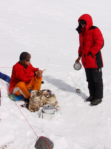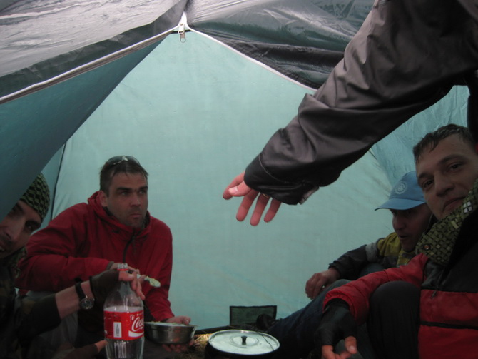 Глаз чуть раньше некоторых самостоятельно добрался до палатки и тотчас уснул. Мертвецки. Так как две еденицы из личного состава убыло, одну из палаток, которую сломанная, ставить не стали. "Звено Павлюченко" расквартировали по освободившимся вакансиям. Нам с Витенькой достался Алексей. Глаз лег пораньше и залез в свой приготовленный заранее спальник. Алексей каким-то образом забрал Витин. Витя, будучи под наркозом, залез между нами просто без спальника. На утро он дал дуба. Мы уже давно вылезли, он дремал и отогревался.