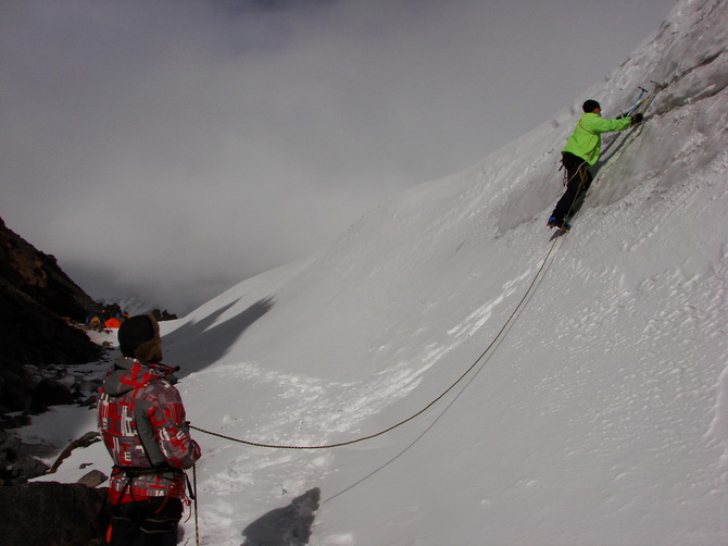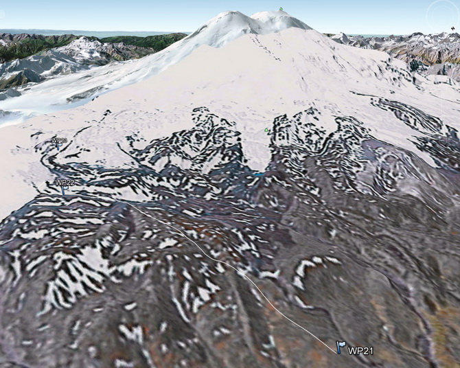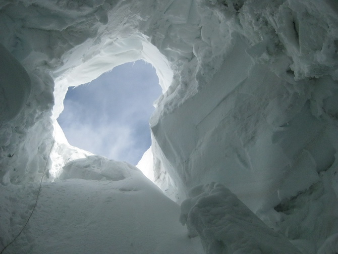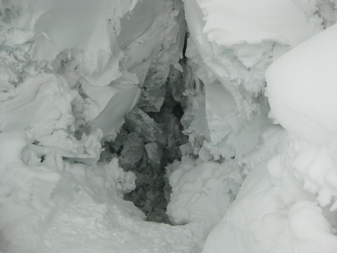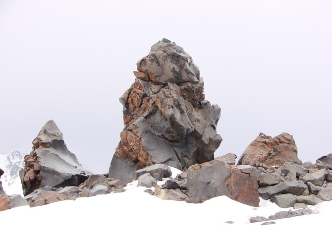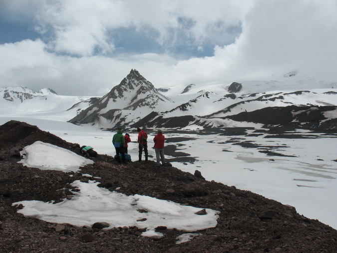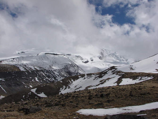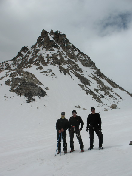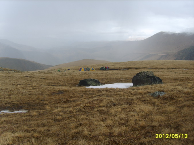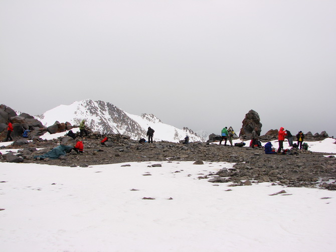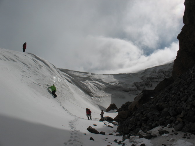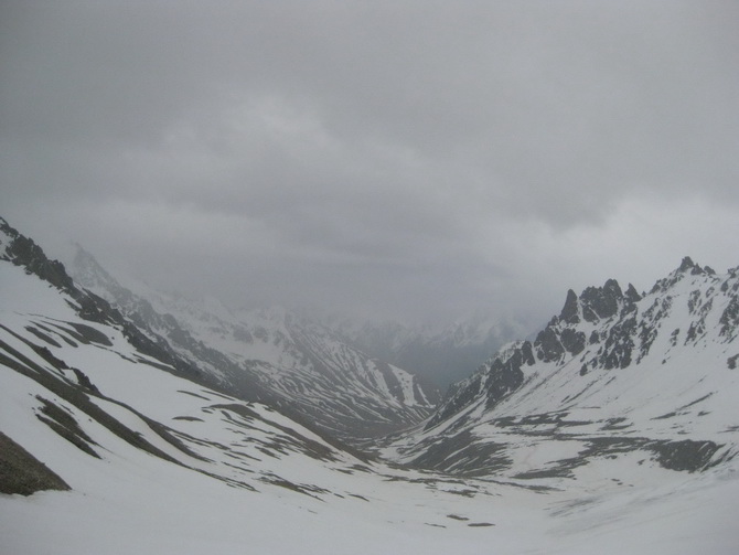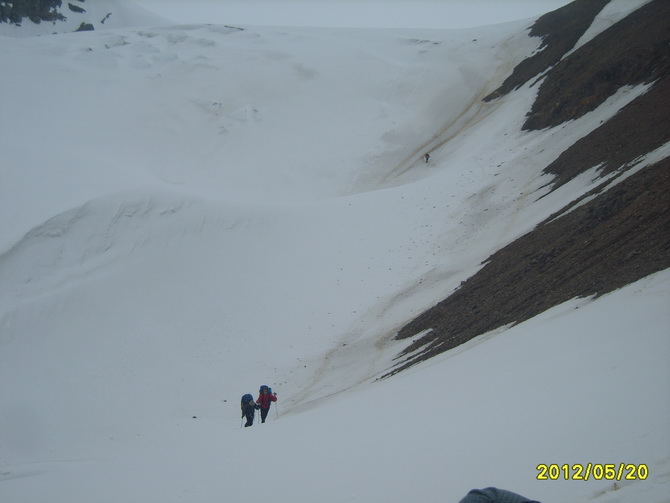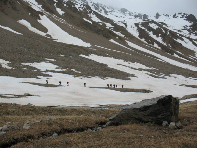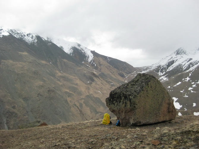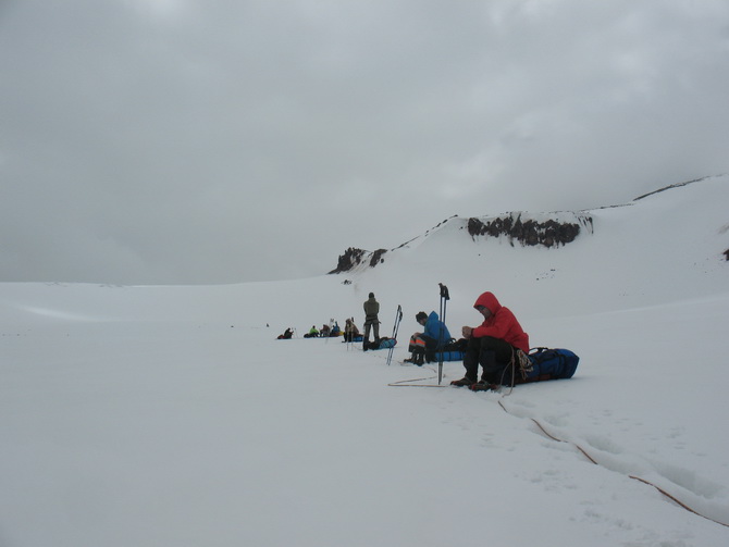 Пошел снег, все поглотила белая поволока. Мы состегнулись в две динамогексососиски. Еще требовалось перейти ледник Ирикчат. В здешние трещины, говорят, дома можно спрятать. Теперь по маю ледник был закрытый. Склон пологий. Сброс высоты до перевала 250 метров. Ориентир на Рыжий бугор. Бугор периодически показывался в непогоде. По мере приближения стал виден явственно.