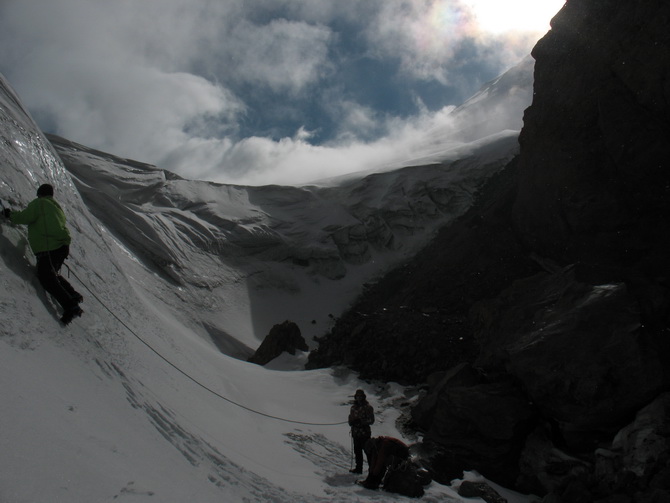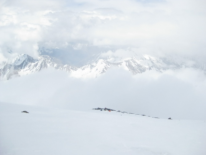 Подъем. Облачно. Вершина Эльбруса видна была не долго в начале. Её быстро затянули тучи, стали напрессовываться и спускаться все ниже. Как вовремя мы взлезли в единственное окно. В коллективе появились китайские пчеловоды (на фото). Под действием мороза, солнца, высоты и прочих факторов многие в походах в кого-то превращаются, обычно непрезентабельного. Спустились к схрону. Запасы, особенно съестные, мы тогда специально уложили в гермомешки. Была поскольку вероятность, что в наше отсутствие было бы это разграблено птицами.