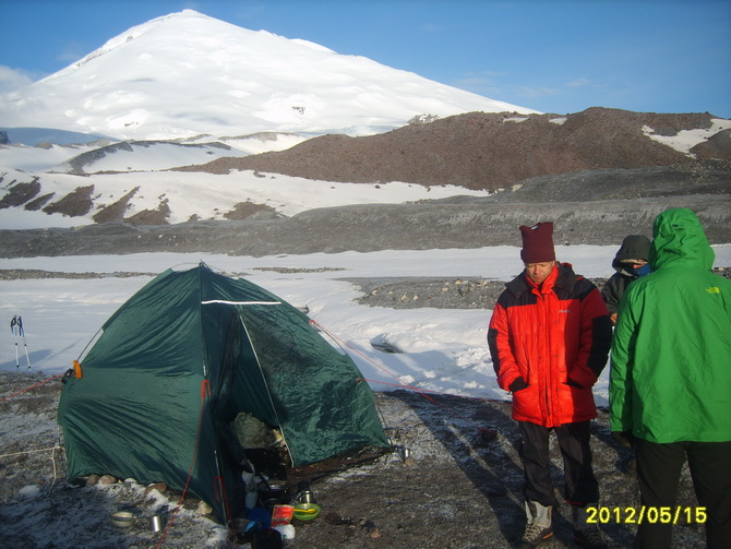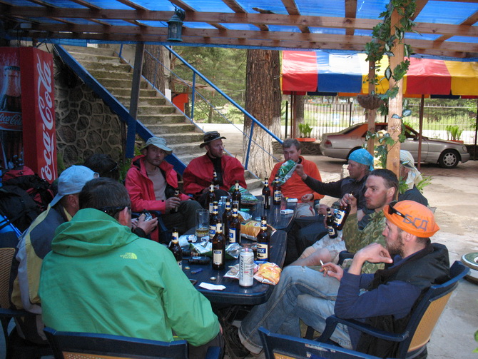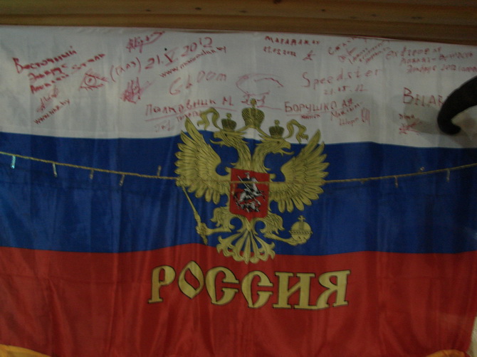 После пивка "Терек" и "5642" парились в бане. С кряхтением и эммоционально. Кого-то из ушата облили холодной водой. Можно было слышать по-женски высокие вопли, не ясно кому принадлежавшие. Дальше был стол. В кафе основой интерьера были флаги групп, поднявшихся на Эльбрус. Хозяин спросил на счет нашего флага. Мнения разделились. Нужен был совет. Связались со Смирновым. Решено было, что флаг у нас есть на крайний случай еще один, да и можно сделать больше. А здесь на стене подобного такого нет, и, пожалуй, как пиар здесь он свое отработает. Факт, что эту "Саклю" посещают регулярно и белорусы. Найдут что-то родственное. Оставили. И еще один российский, каким-то боком оказавшийся у Алексея. На наш черный, автографы не оставишь. Оставили на российском. А стол был вполне...