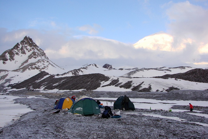 Костер был жаркий. В ледниковой зоне был Полковник, Витя, Глаз и Максым-Шаро. Остальных, как посвящение, били лопатой по жопе. Причем нужно было клювом ледоруба держаться за какой-то естественный бруствер. После лопатой по жопе, Витя наливал по пол-стакана 50-и градусного спирта. Били всех, кроме перечисленных. С каждым следующим человеком (шли они не подряд, в промежутках возвращались к костру) Глаз все более разогревался и всё сильнее размахивал лопатой. Все эммоциональнее были речи, все громче кричал гроулингом, а удар по заднице лопатой сопровождался все более одобрительными возгласами и поощрительными овациями. Не знаю во что бы посвящение переросло дальше, но благо закончились посвящаемые и потом стало темнеть.